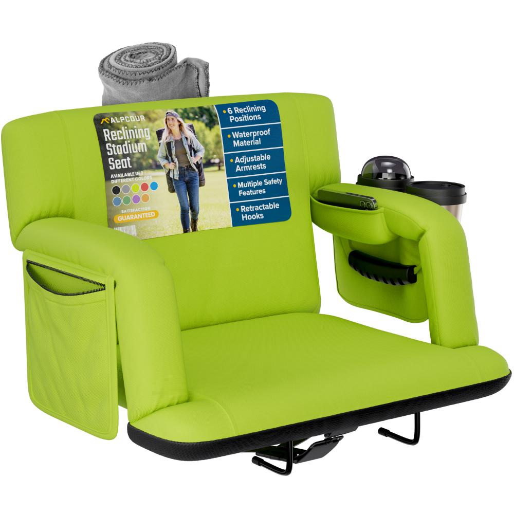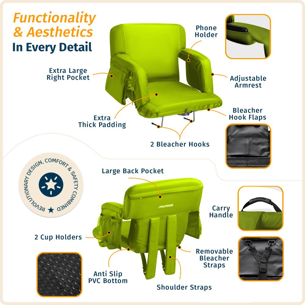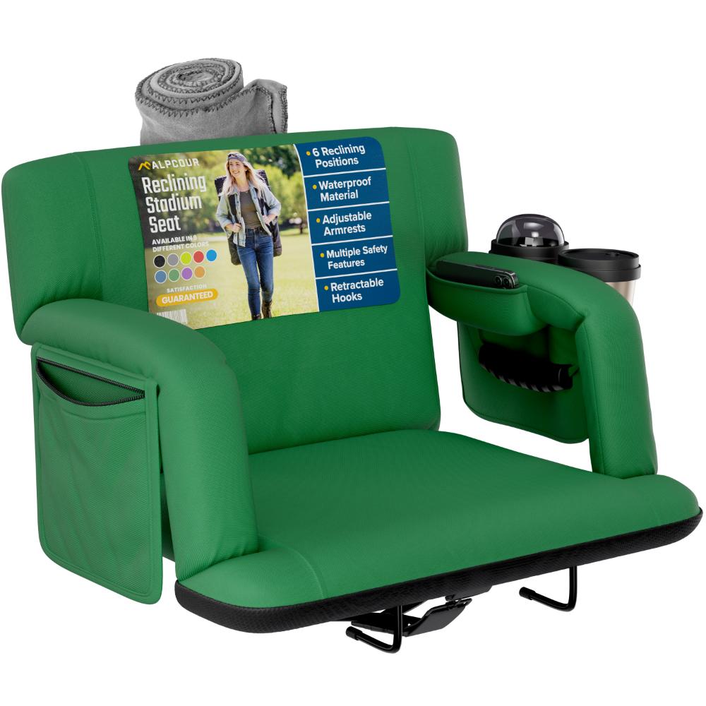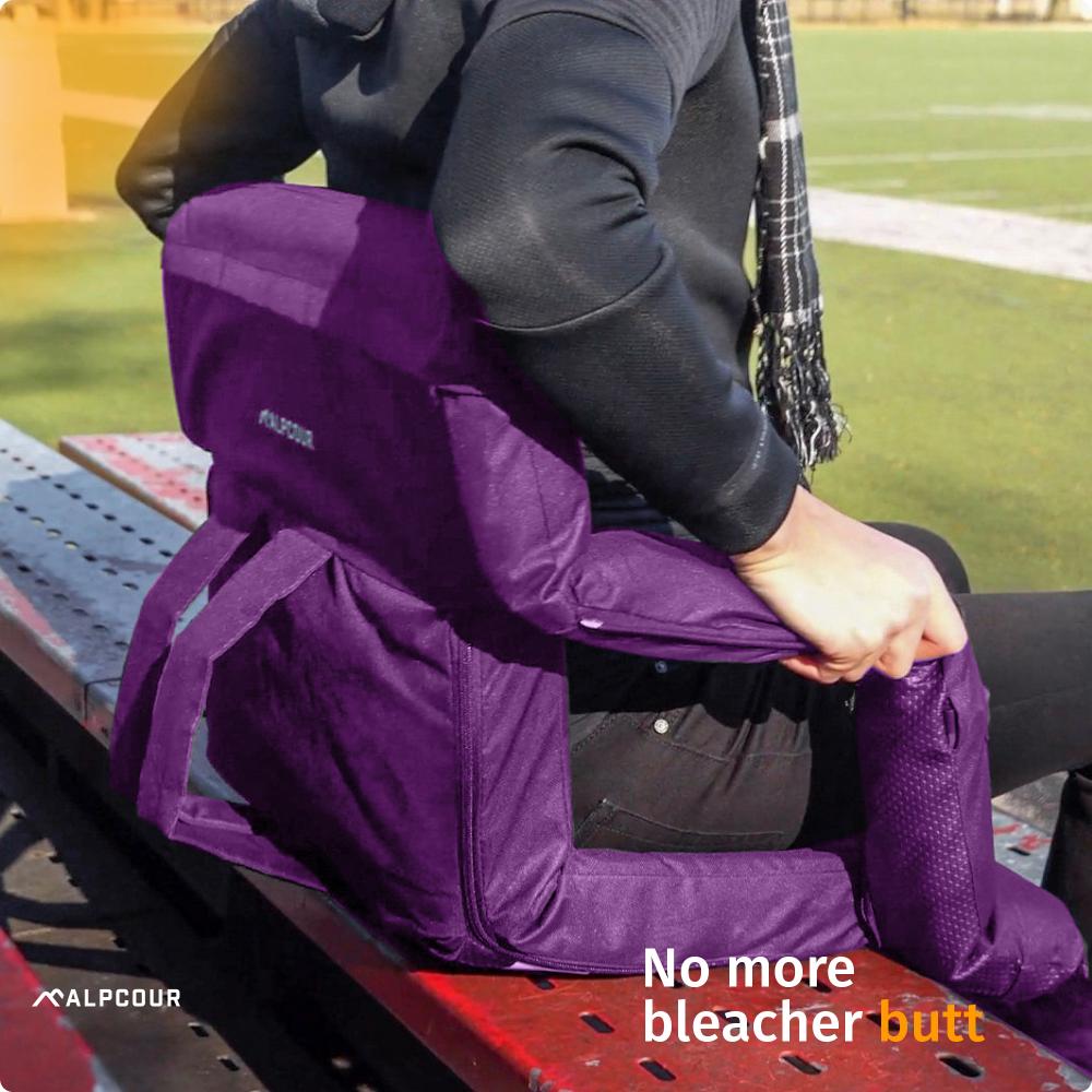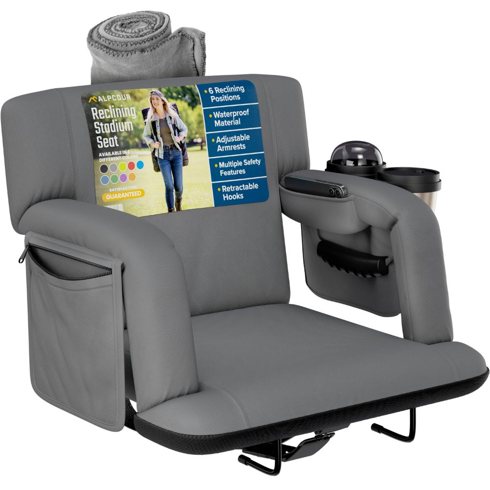An upgraded reclining stadium chair built for long-game comfort and secure bleacher use. Supportive cushioning and fold-down armrests let you enjoy game-day comfort, while multiple storage pockets keep your essentials organized. Added safety features help the seat stay put on busy game days.