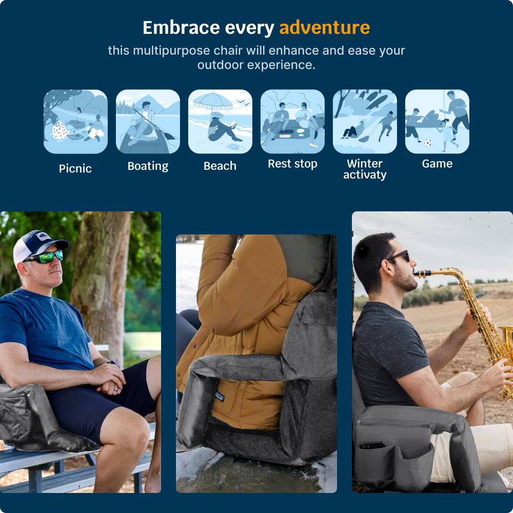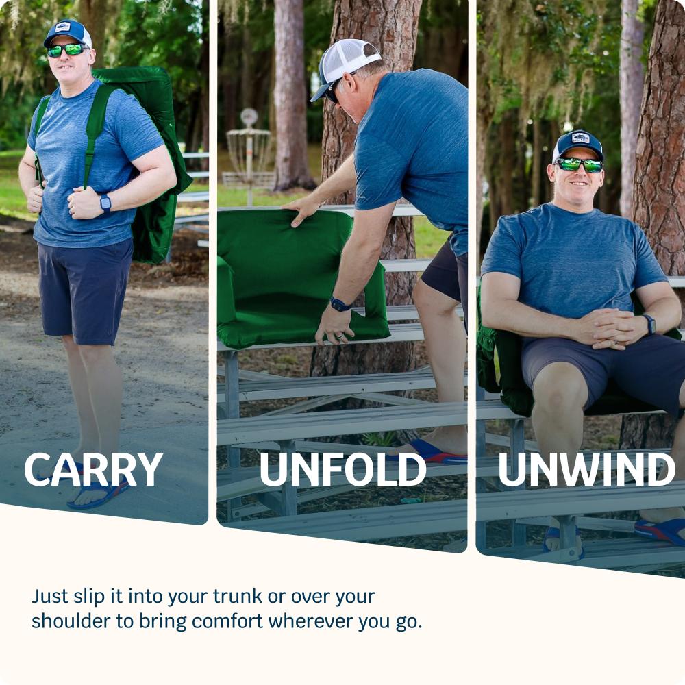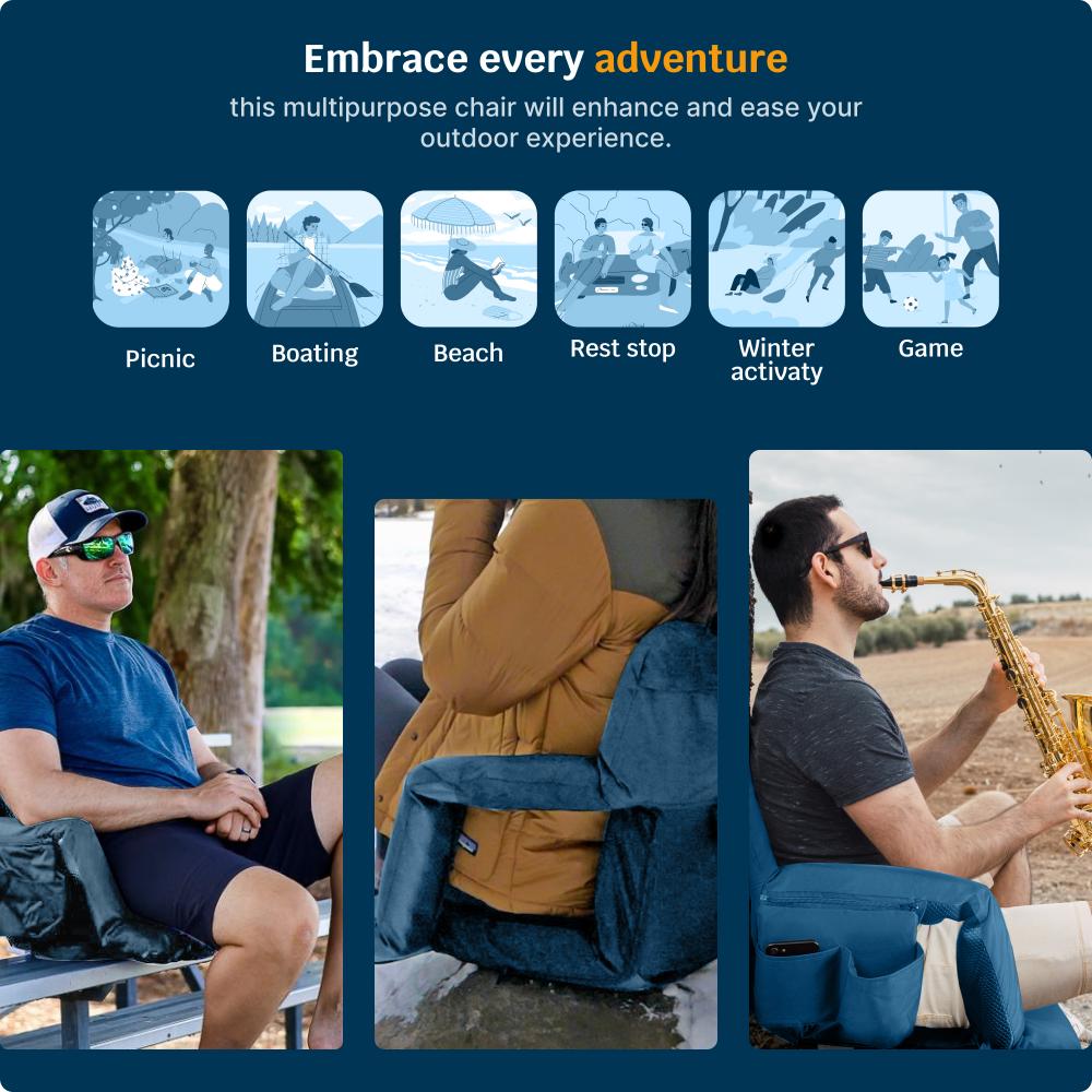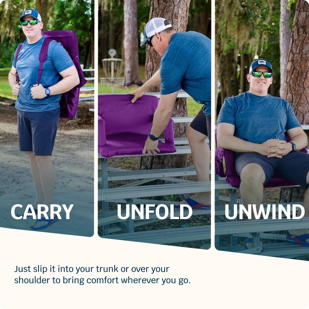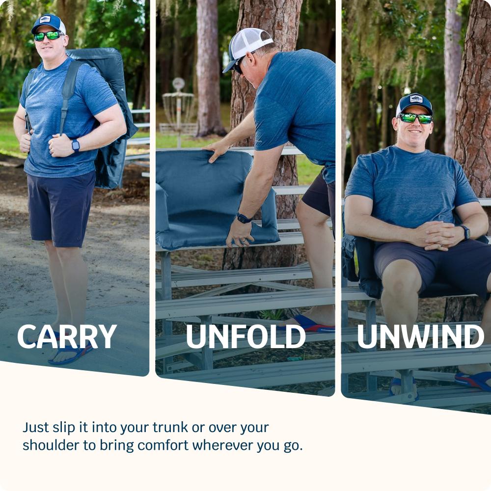 An upgraded reclining stadium chair built for long-game comfort and secure bleacher use. Supportive cushioning and fold-down armrests let you enjoy game-day comfort, while multiple storage pockets keep your essentials organized. Added safety features help the seat stay put on busy game days.