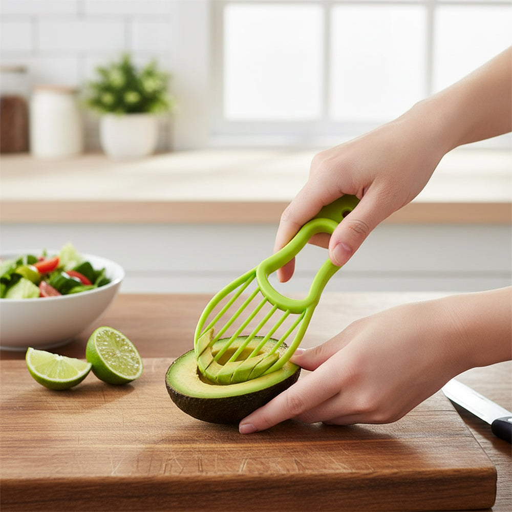 This handy avocado slicer allows you to easily peel the avocado, remove the pit, and slice it for toast, salad, sushi, and more.