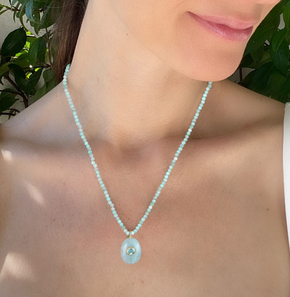 An elegant statement of natural beauty. This choker features a smooth oval aquamarine pendant accented with a bezel-set sky blue topaz framed in 14K gold–plated sterling silver, which dangles gracefully from a strand of finely faceted larimar beads. This timeless design balances rich color and refined sparkle, making it a versatile piece for both everyday wear and special occasions.