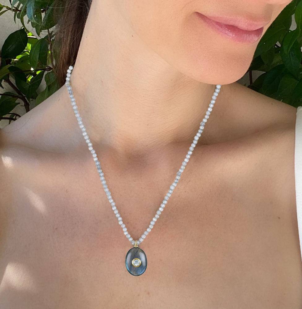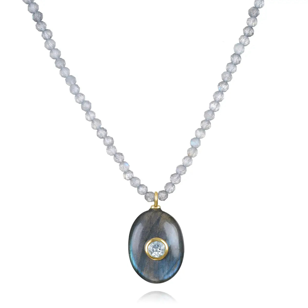 An elegant statement of natural beauty. This choker features a smooth oval labradorite pendant accented with a bezel-set white topaz framed in 14K gold–plated sterling silver, which dangles gracefully from a strand of finely faceted labradorite beads. This timeless design balances rich color and refined sparkle, making it a versatile piece for both everyday wear and special occasions.