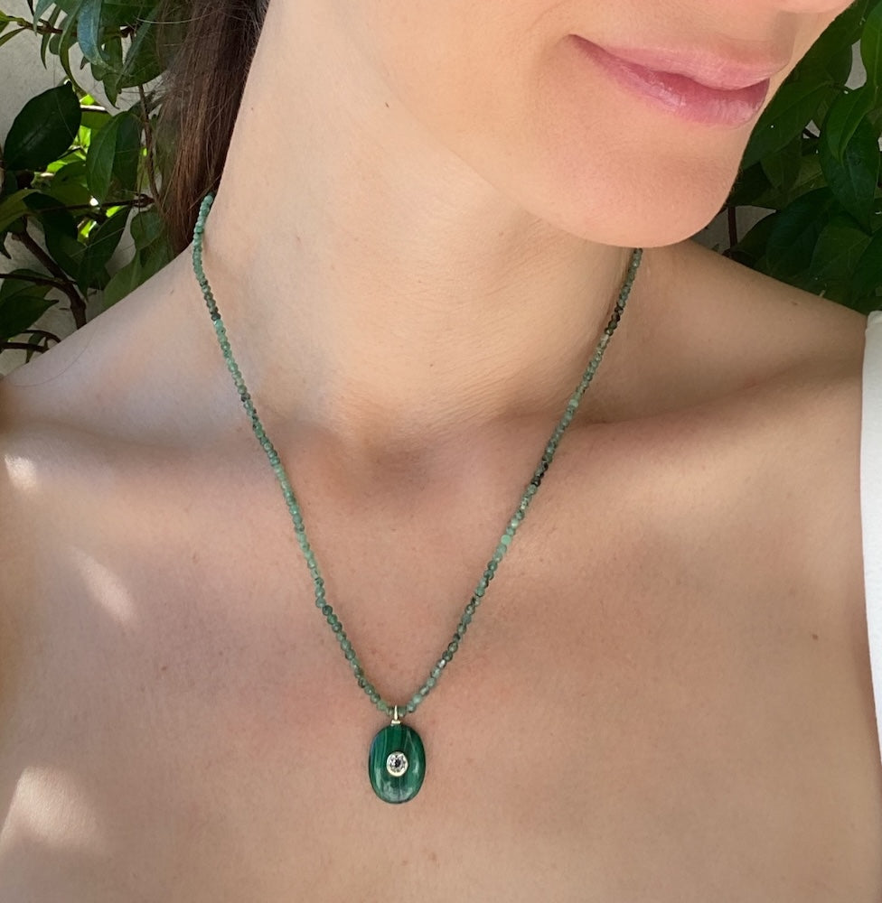 An elegant statement of natural beauty. This choker features a smooth oval malachite pendant accented with a bezel-set white topaz framed in 14K gold–plated sterling silver, which dangles gracefully from a strand of finely faceted emerald beads. This timeless design balances rich color and refined sparkle, making it a versatile piece for both everyday wear and special occasions.