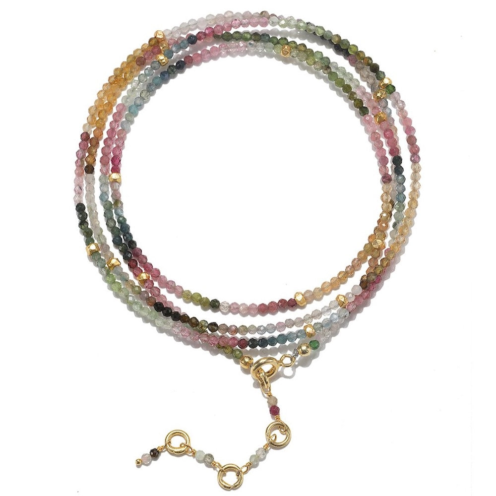 Effortlessly elegant and endlessly versatile, this exquisite wrap is adorned with finely faceted semi-precious tourmaline stones that shimmer with a spectrum of natural color. Designed with an adjustable length, it wraps gracefully four to five times around most wrists as a bracelet, or can be styled as a long, fluid necklace or doubled for a chic layered look.