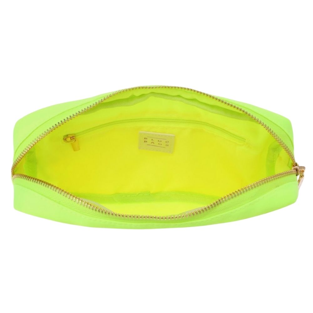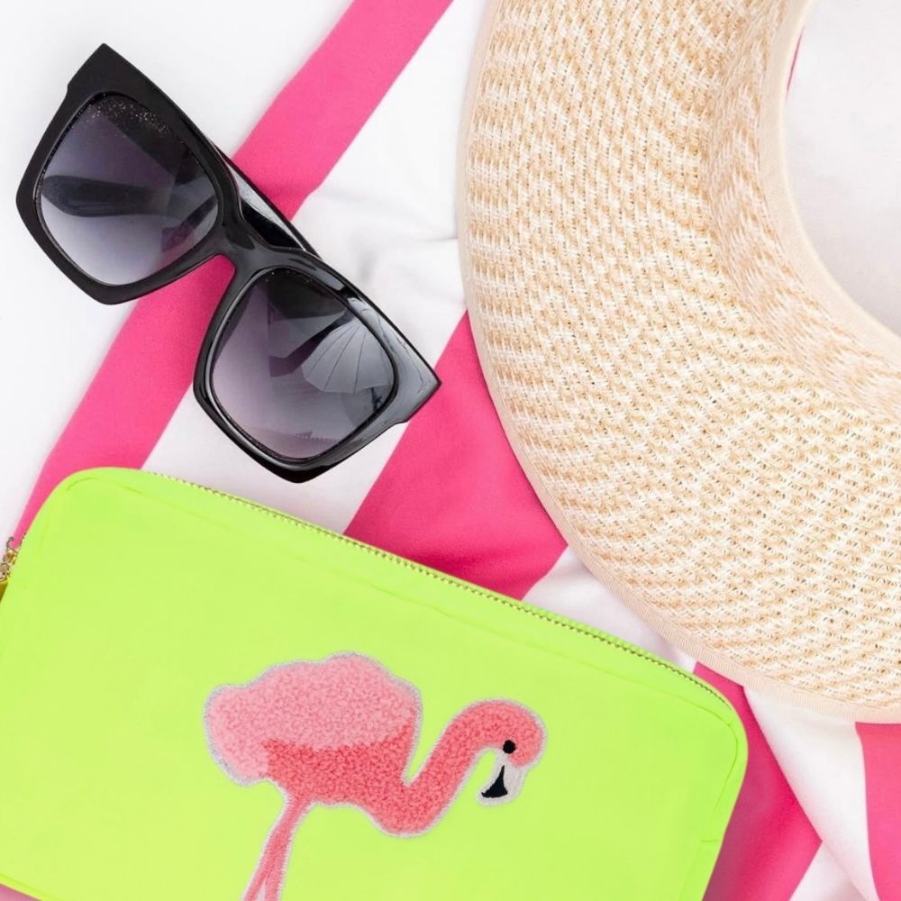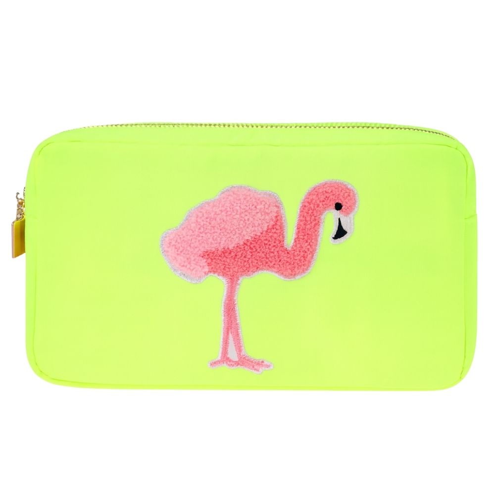 A chenille flamingo appliqué and gleaming hardware refine this nylon-canvas cosmetic bag with a trio of interior pockets to keep essentials organized.
