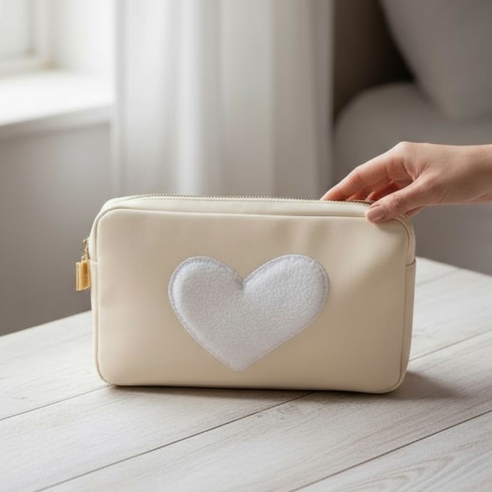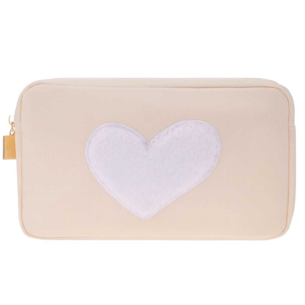 A chenille heart appliqué and gleaming hardware refine this cream nylon-canvas cosmetic bag with a trio of interior pockets to keep items organized. The bag helps keep cosmetics and skincare essentials lovingly secured when at home and on the go.