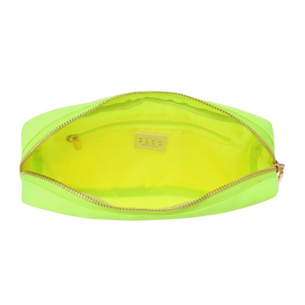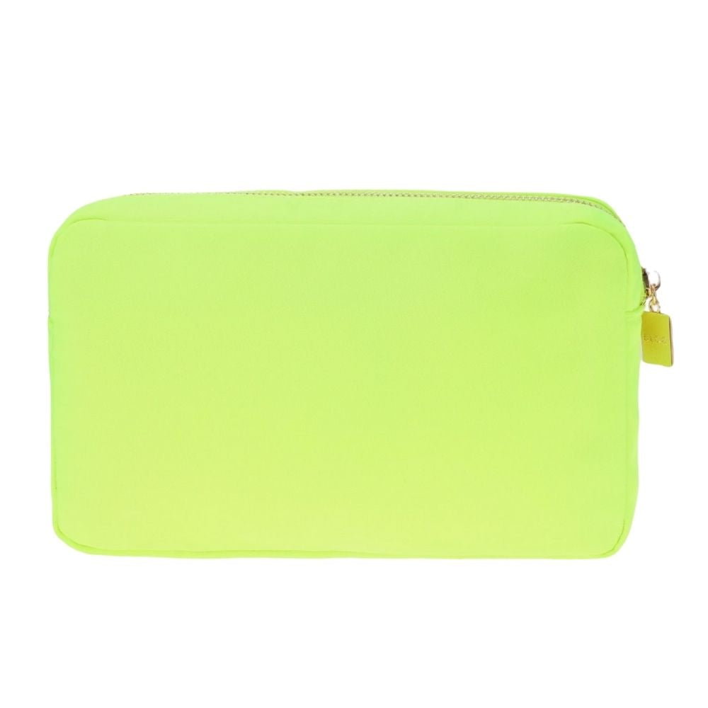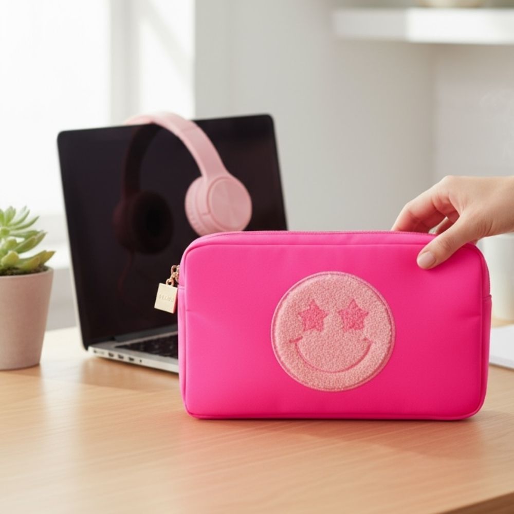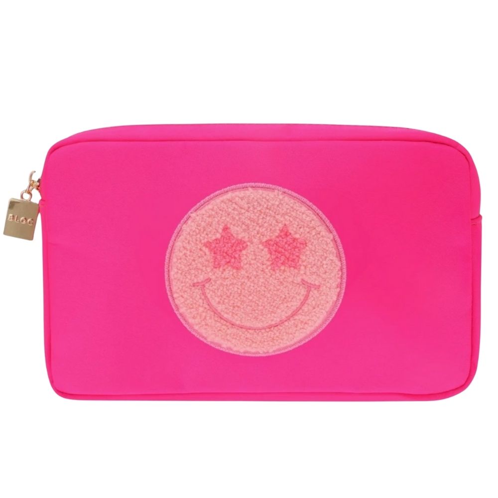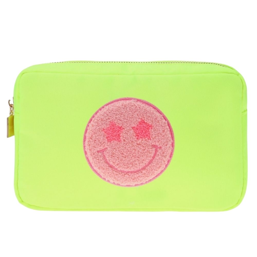 A bright and cheery cosmetics bag featuring a starry-eyed smiley face chenille appliqué on the front. It's designed with a convenient zip closure and interior pockets for easy organizing. This bag helps keep cosmetics and skincare essentials lovingly secured when at home and on the go.