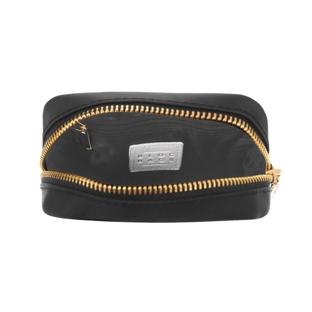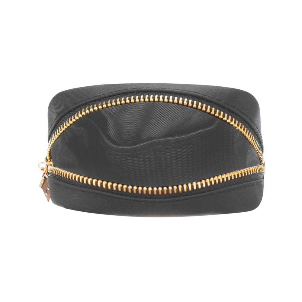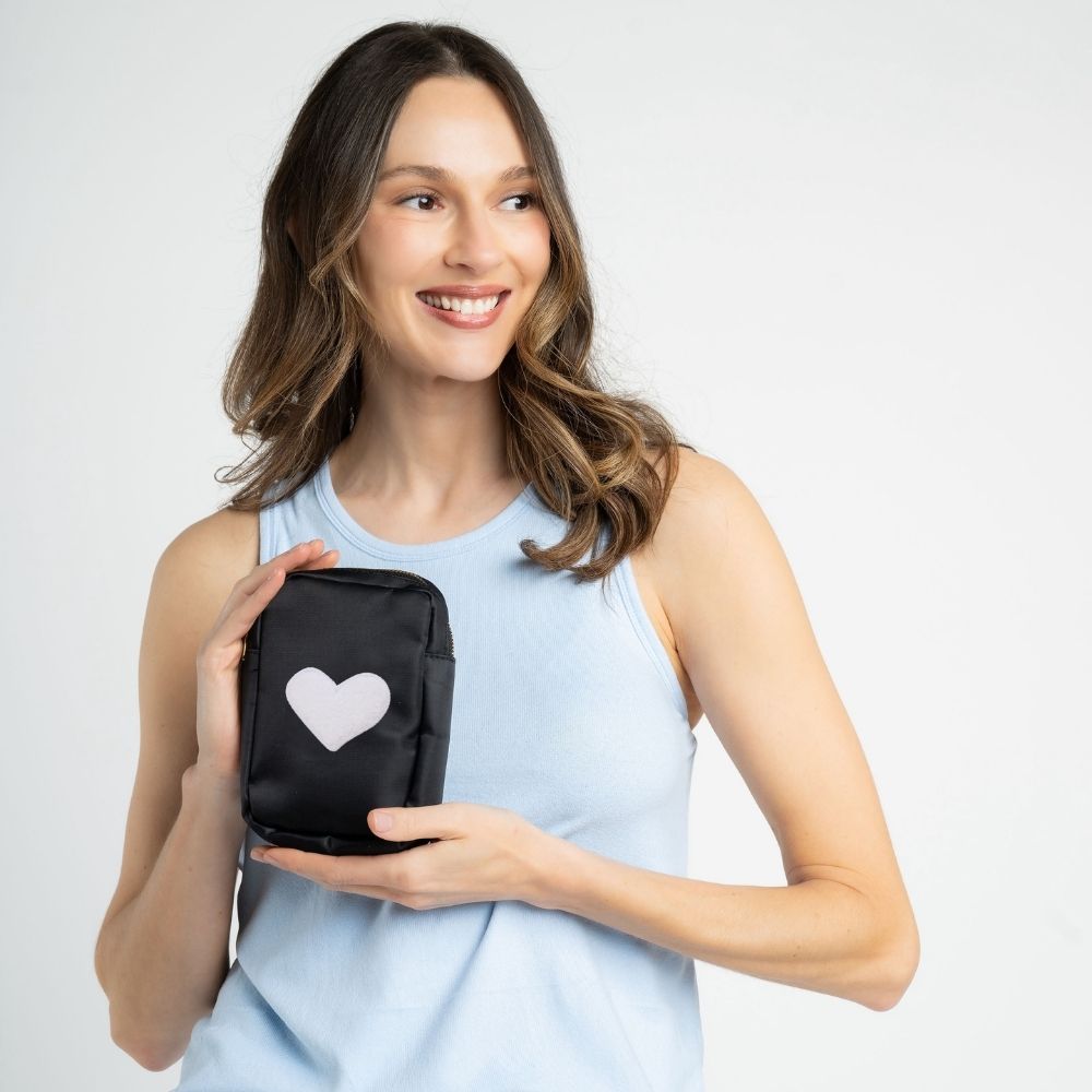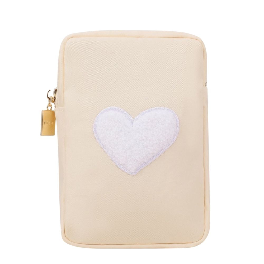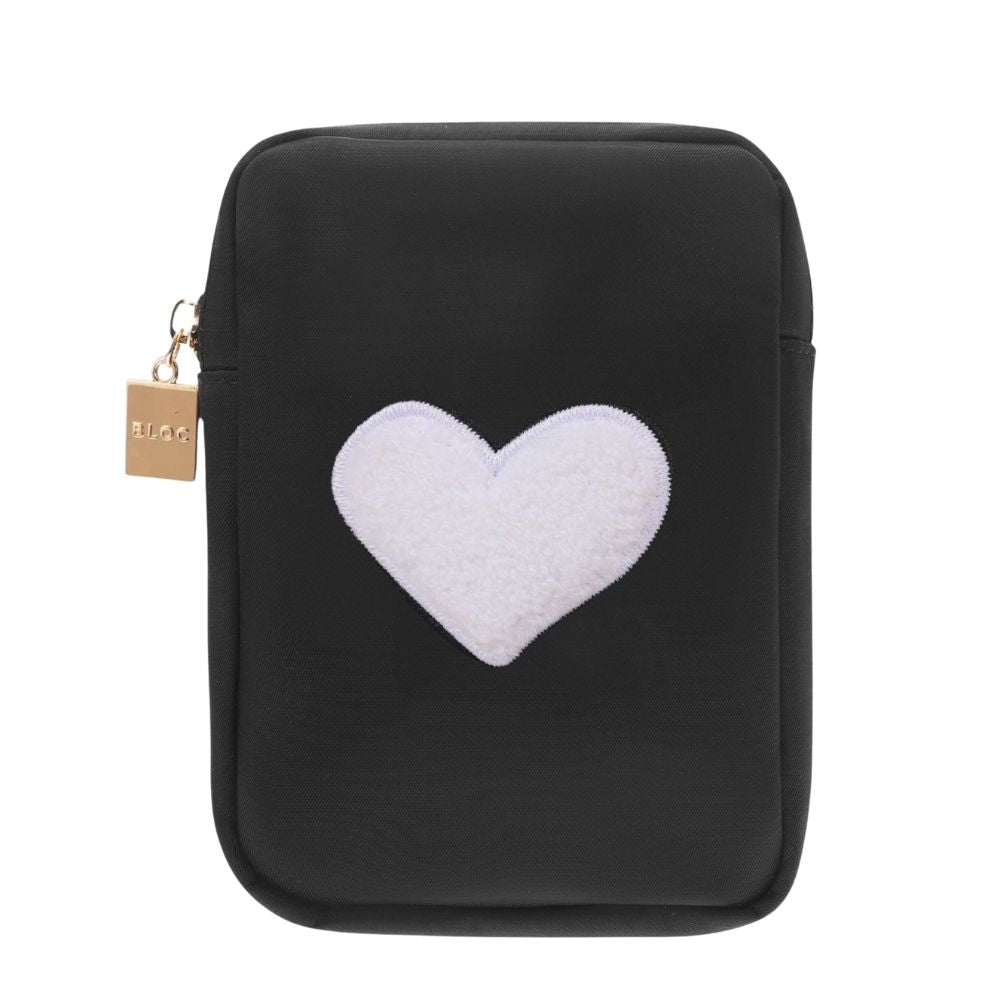 A mini nylon cosmetics bag featuring a darling chenille heart patch on the front. This bag is ideal for storing lipstick and other smaller cosmetics when at home and on the go. It’s designed with a convenient top zip closure and interior pockets for easy organizing.