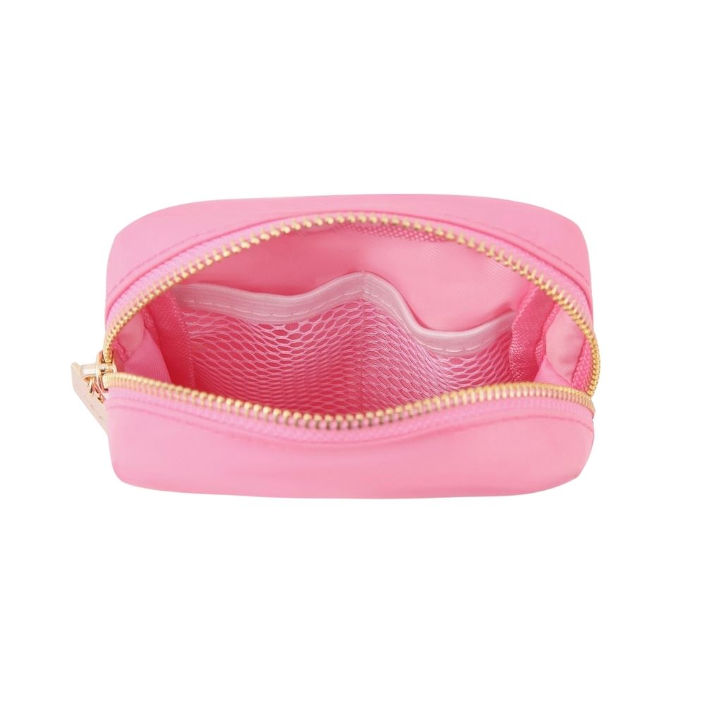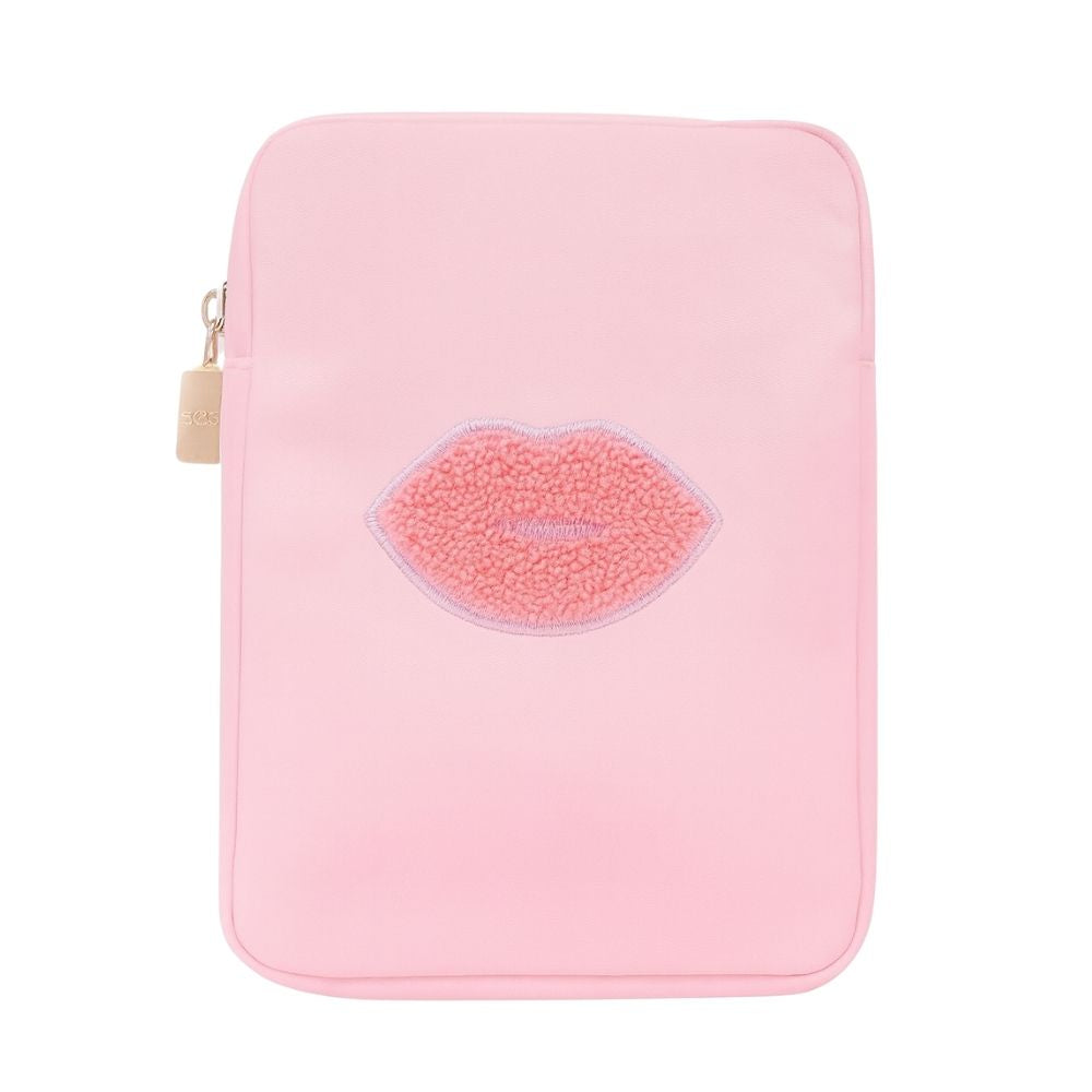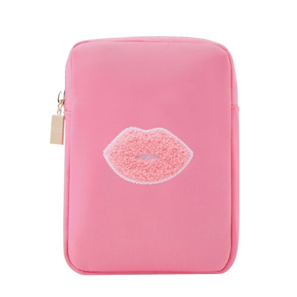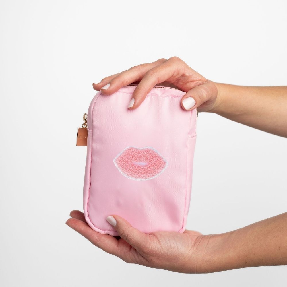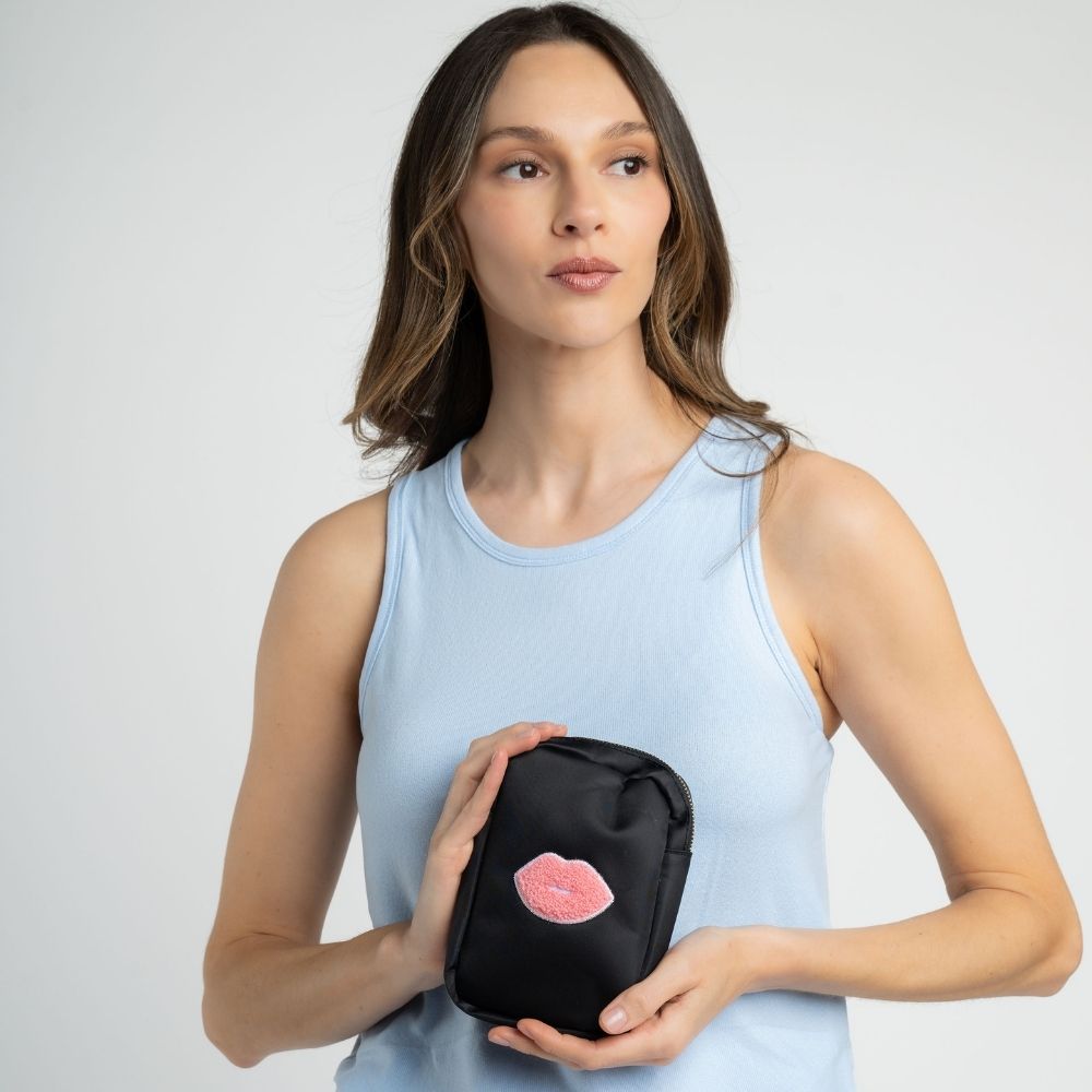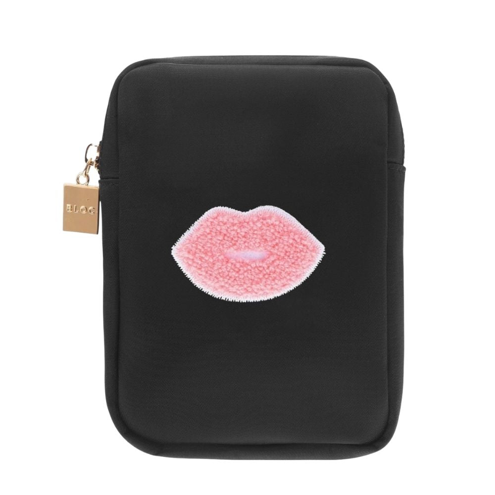 A chenille lips appliqué and gleaming hardware refine this nylon-canvas cosmetics bag with an interior zip pocket to keep small items organized. This mini-sized bag is ideal for holding lipsticks and other small cosmetics.