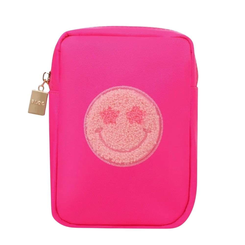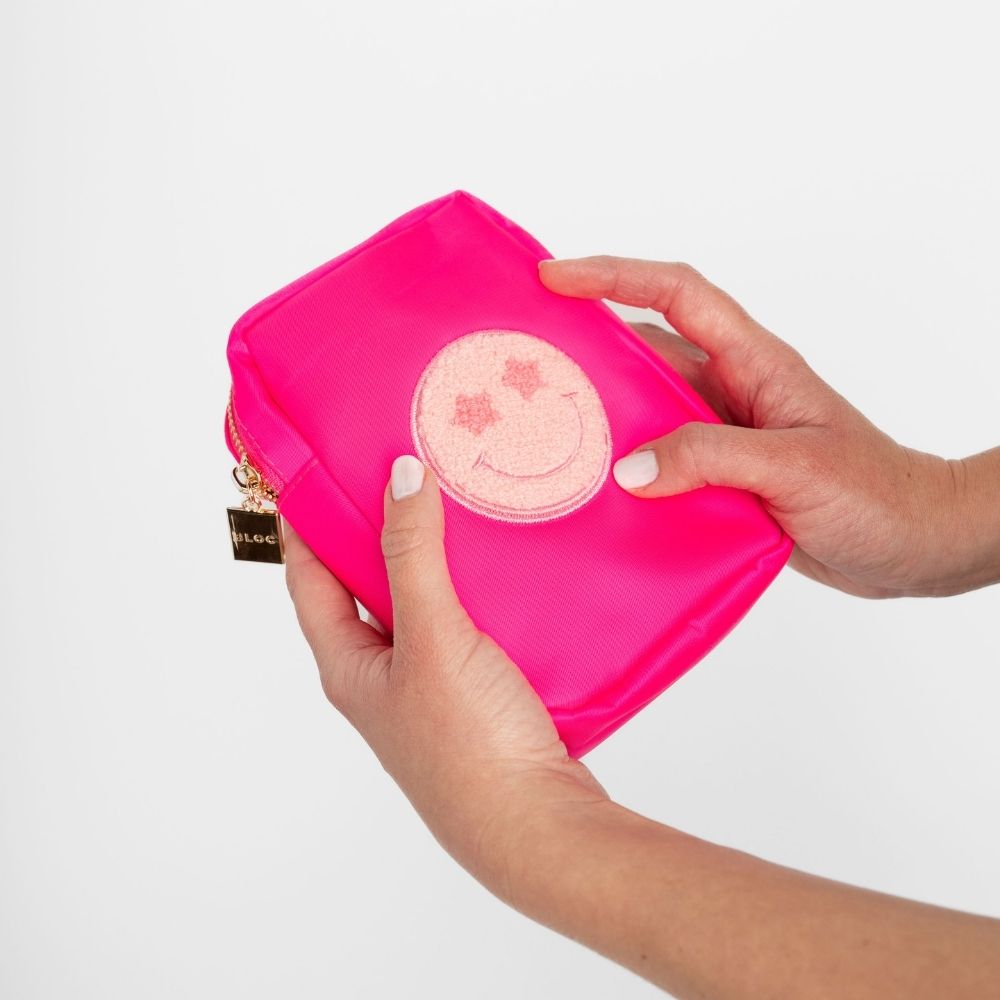 A neon mini cosmetics bag decorated with a starry-eyed smiley chenille appliqué on the front. This mini bag is sure to instantly brighten your day with its playful design and bright color. A convenient zip closure and interior pockets make organizing essentials easy, and it’s ideal for storing lipstick and other small cosmetics when at home and on the go.