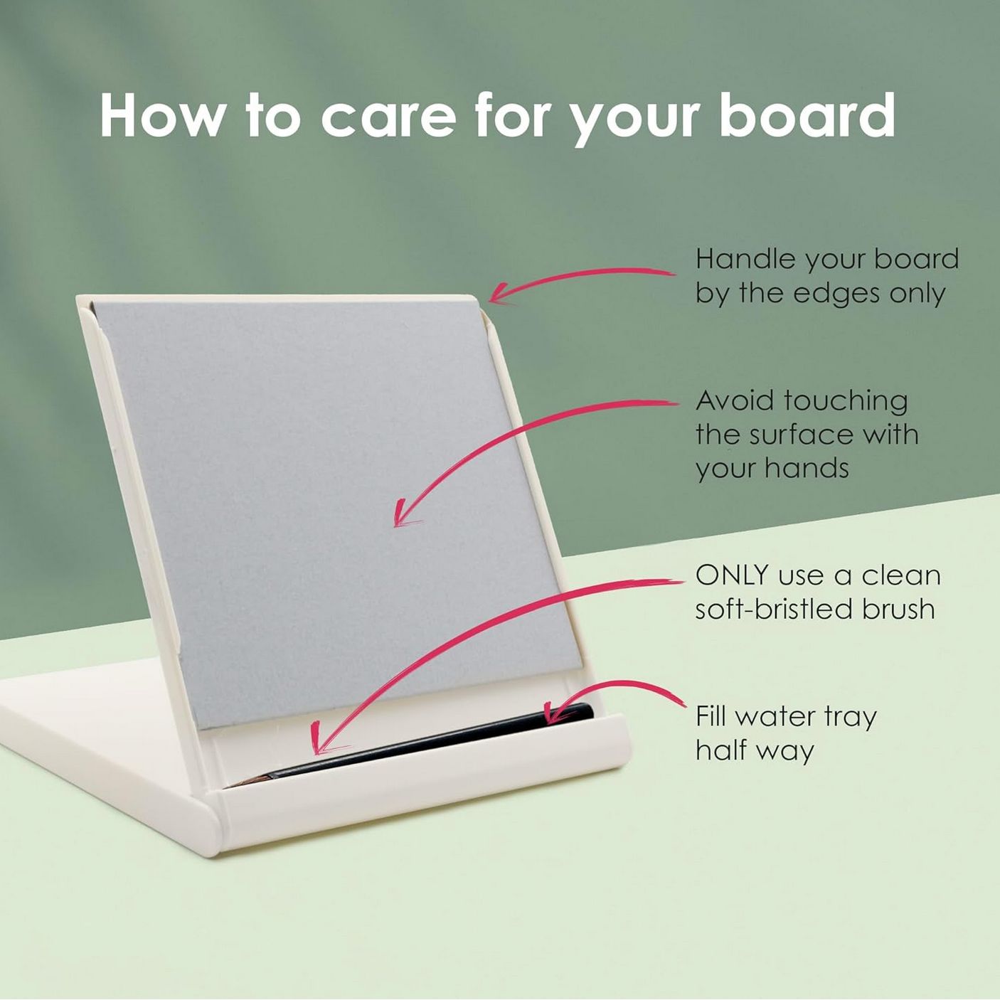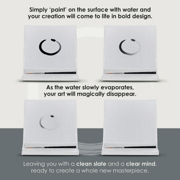 Master the art of letting go...the Mini Buddha Board is environmentally friendly—no ink, no paint, no chemicals—and will last for years with proper care. Simply fill water in the trough, dip your mini brush, and start drawing, painting, and writing.