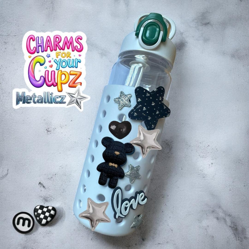 Customize your Charm Water Bottle (sold separately) with Metallicz Charms! This bundle comes with an assortment of star and heart charms, as well as a teddy bear. The creative options for your water bottle are endless!