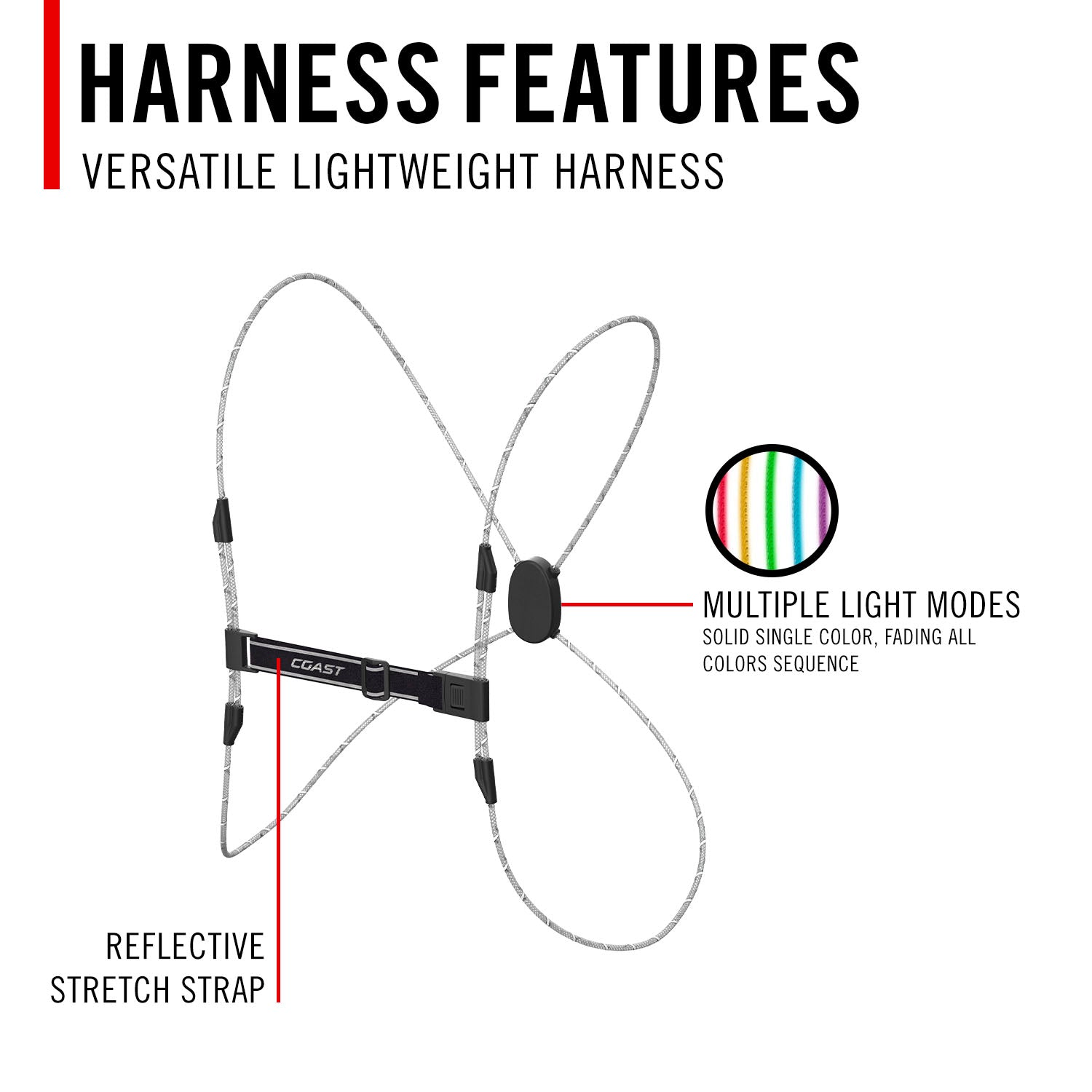 Color modes: Use the power button to turn on harness and cycle through color modes. After 5 seconds in any mode, pressing the power button will turn off the harness