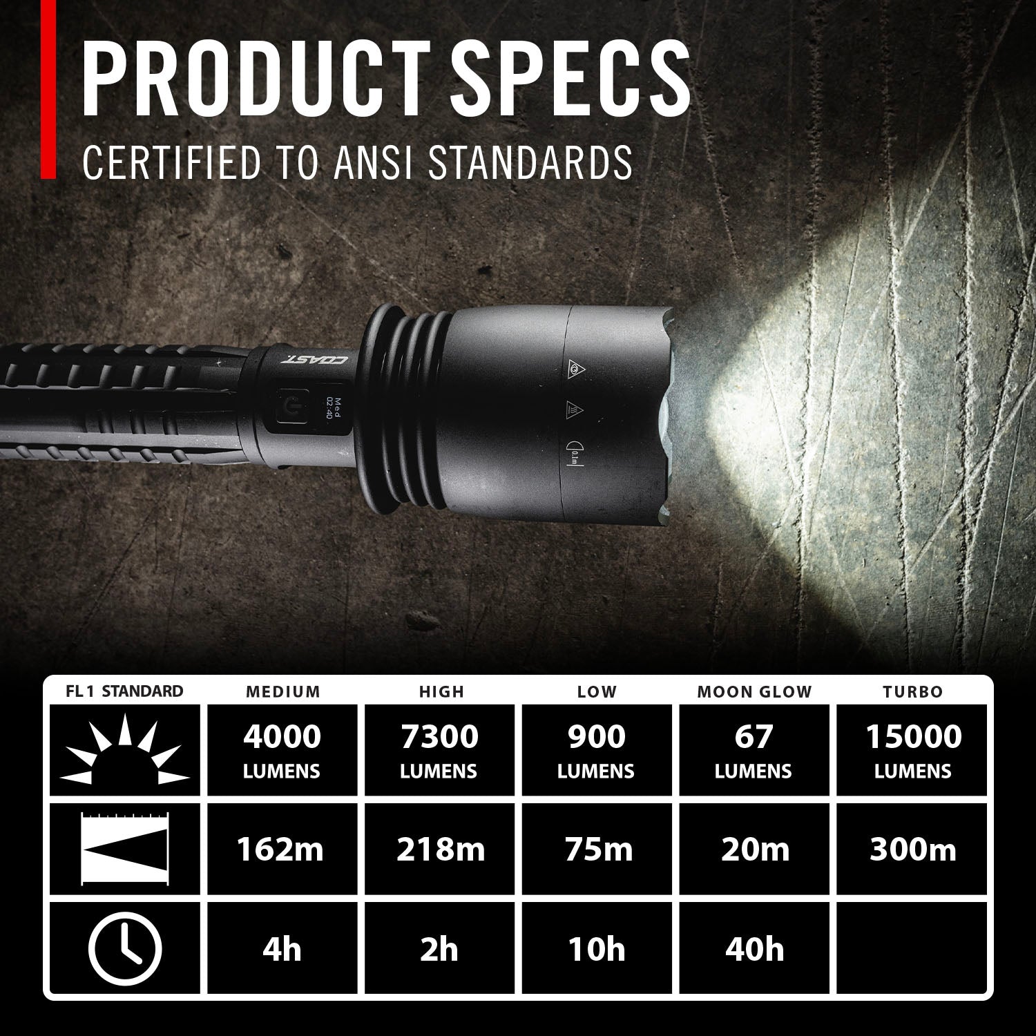 Take light to an all-new level. Built for maximal output, the XP80R Rechargeable Flashlight is top-quality, portable lighting on absolute overdrive—peaking at 15,000 lumens. This five-mode flashlight—medium, high, low, Turbo, MoonGlow™—features a Focusing Pure Beam adjusted at the easy push or pull of the SLIDE FOCUS®.