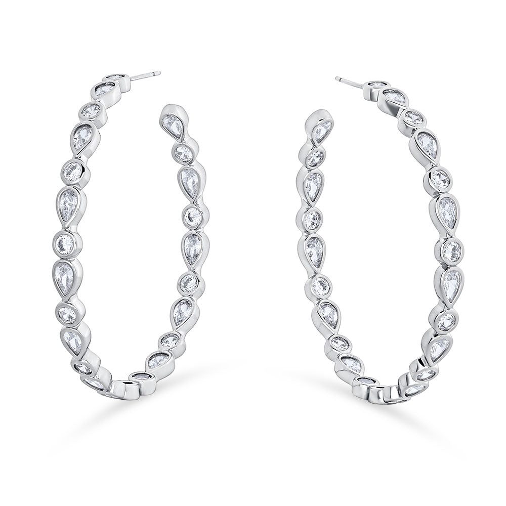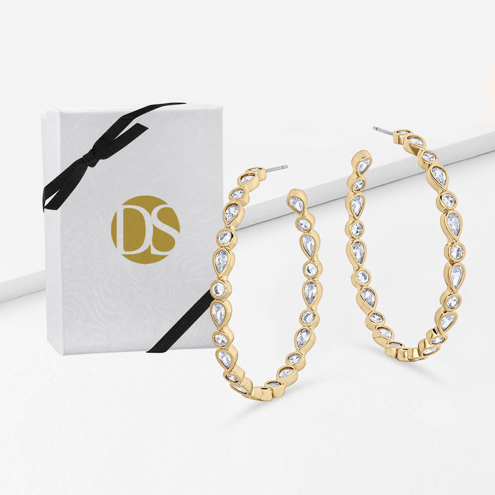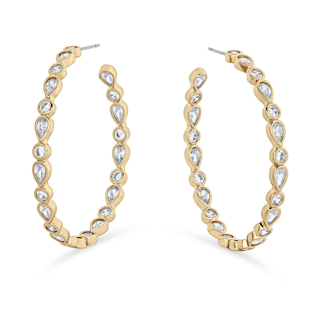 Elevate your ensemble with the Michaela Mixed-Cut Hoop Earrings, where glamour meets sophistication. These captivating 2” hoops are adorned with an array of dazzling mixed-cut stones, including round and pear shapes. The stones are meticulously arranged to create a radiant, multidimensional effect that wraps around your ears with a bold, luminous presence.