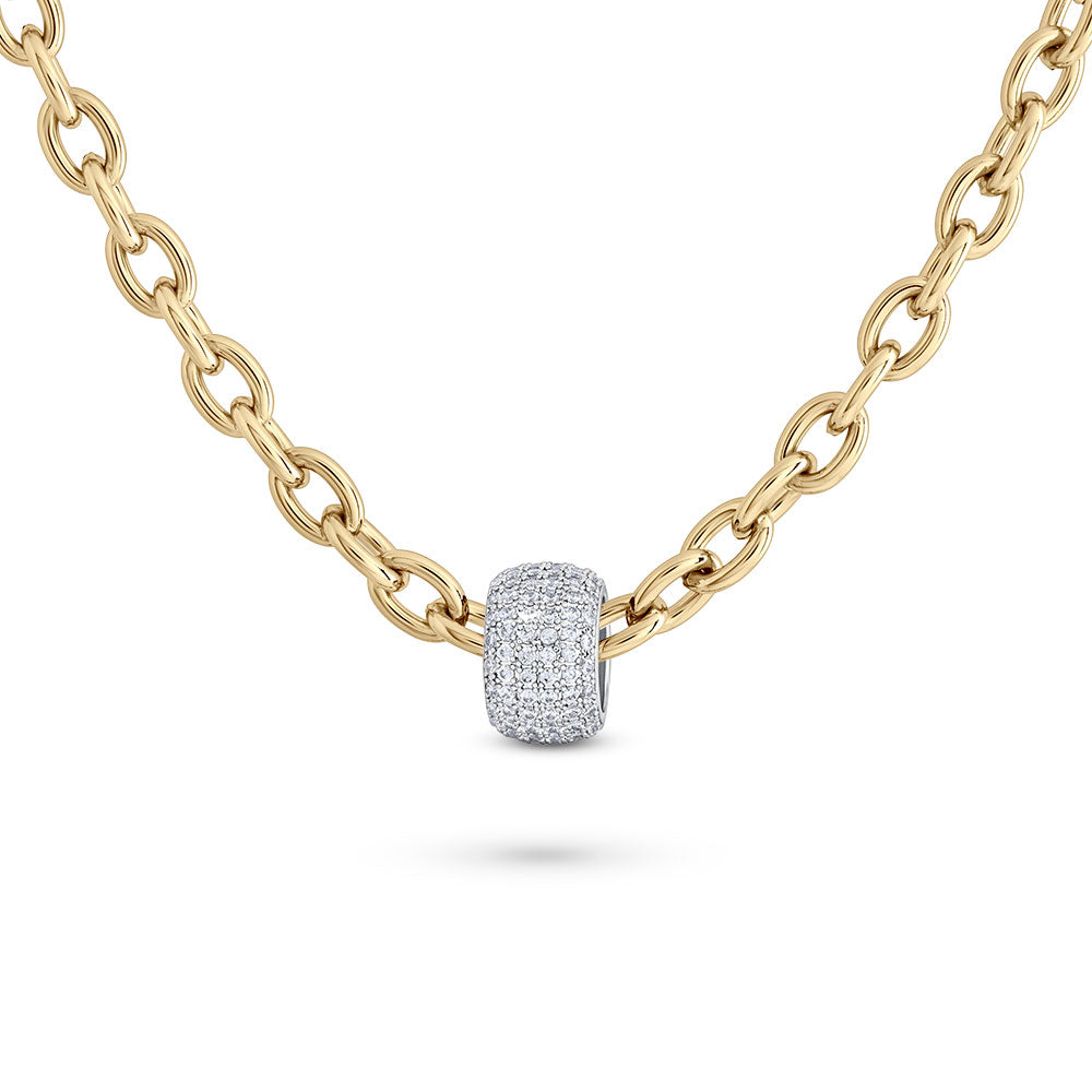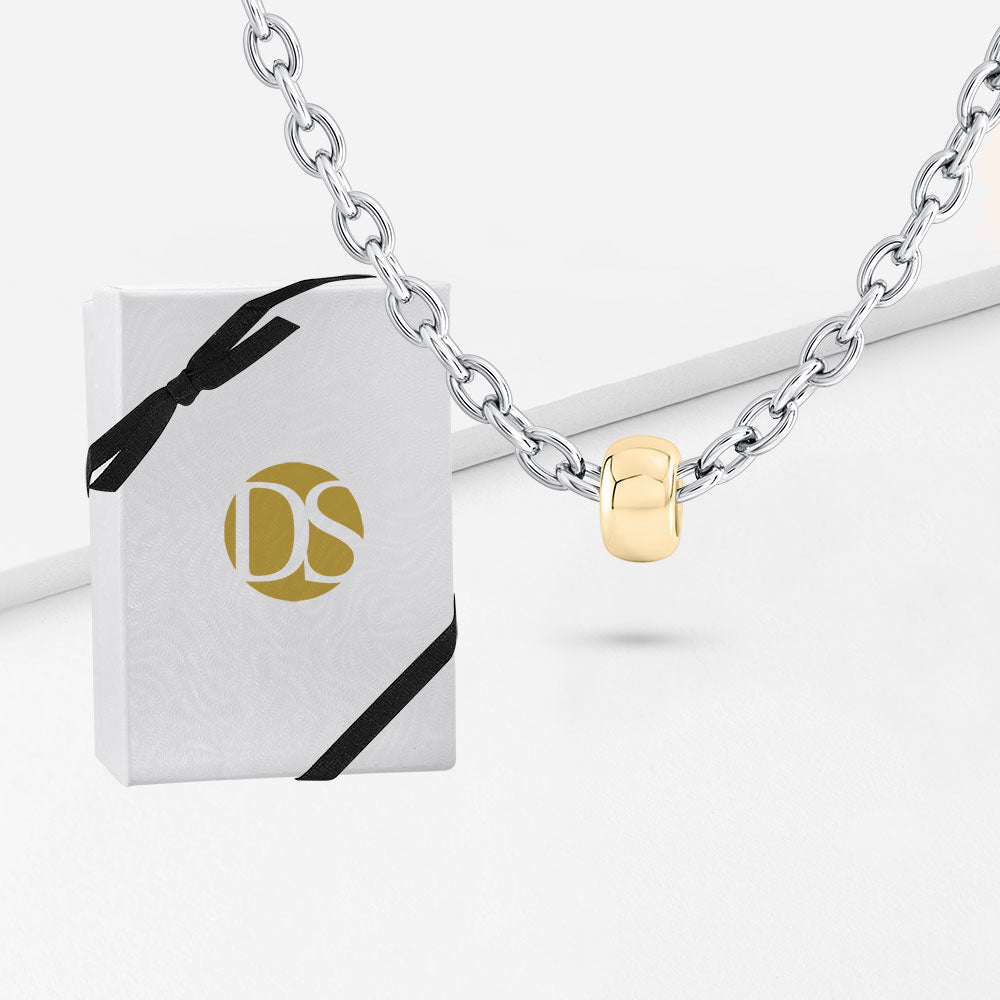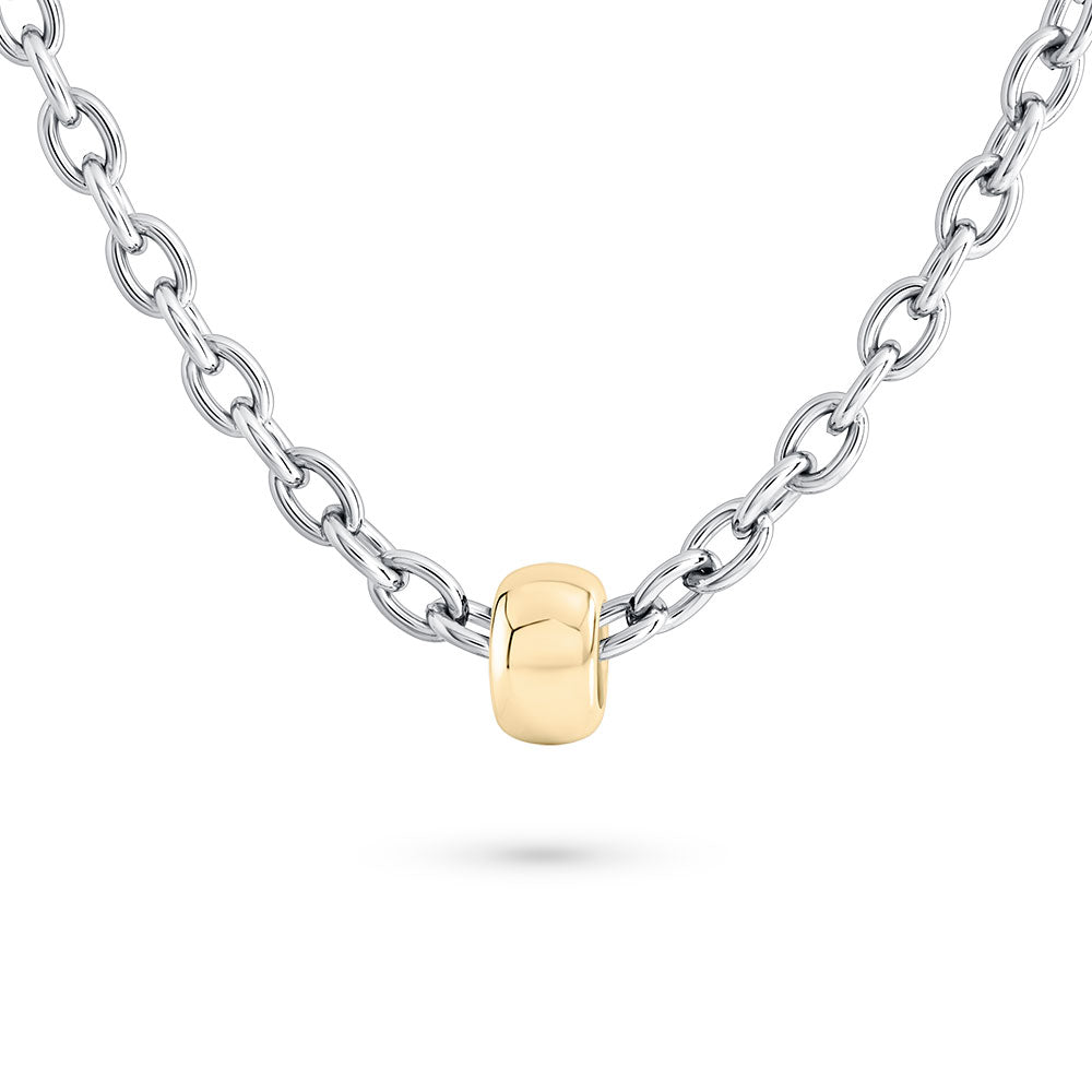 Sophisticated and modern, the Rondelle Two-Tone Charm Necklace features a striking combination of a link chain and rondelle charm. The delicate contrast between the polished gold and shimmering silver creates a refined, versatile piece that can easily be worn alone for a sleek, elegant look or layered with other pieces for added style.