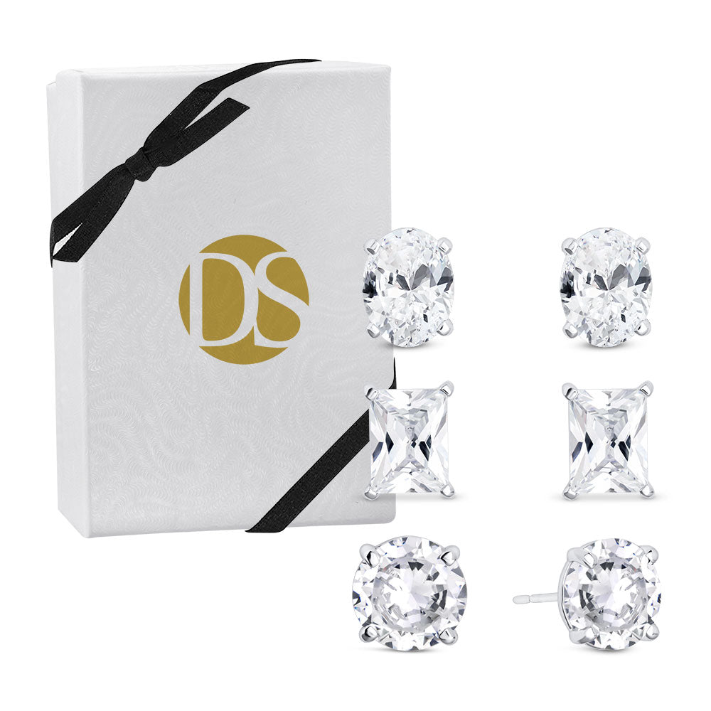 Indulge in the versatile elegance of the Sparkle Like a Star Set, a trio of captivating earrings that harmoniously combine round, oval, and emerald-cut stones for a dazzling variety. Each earring features a prong-set stone, offering a secure, comfortable fit for everyday wear.
