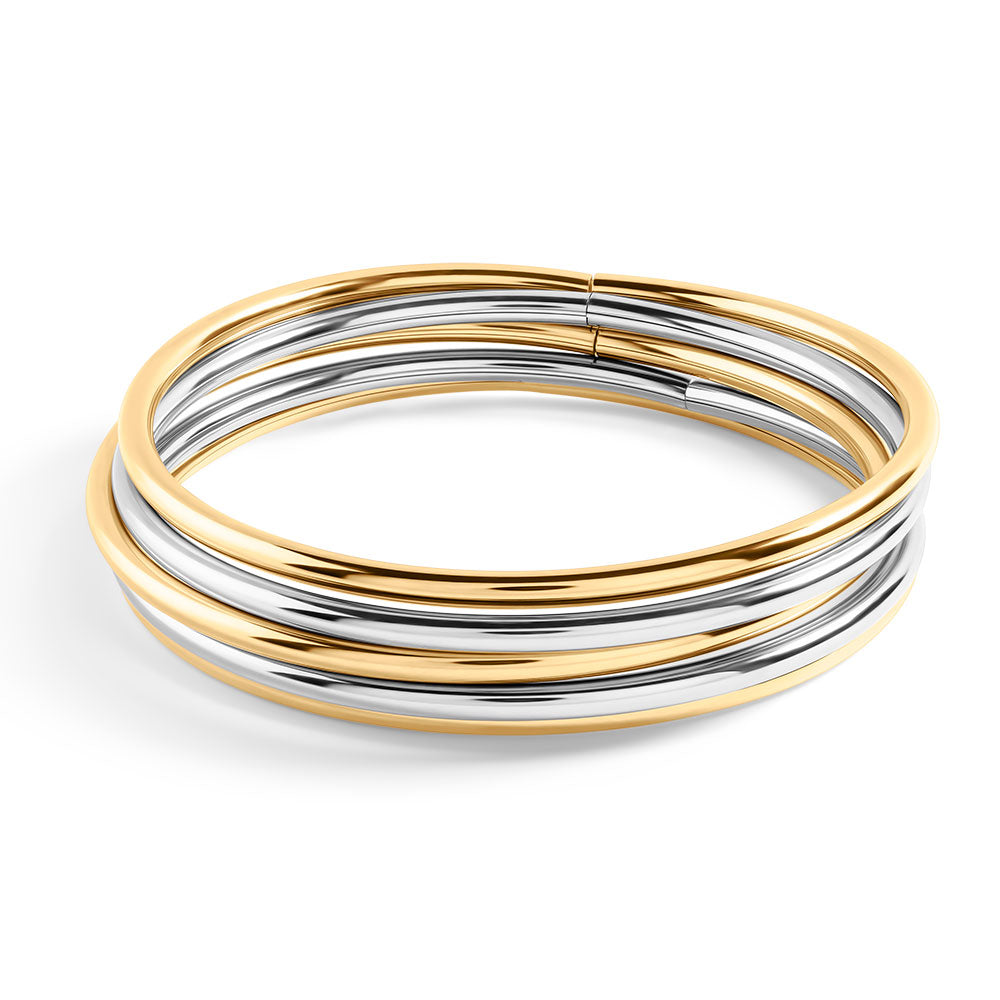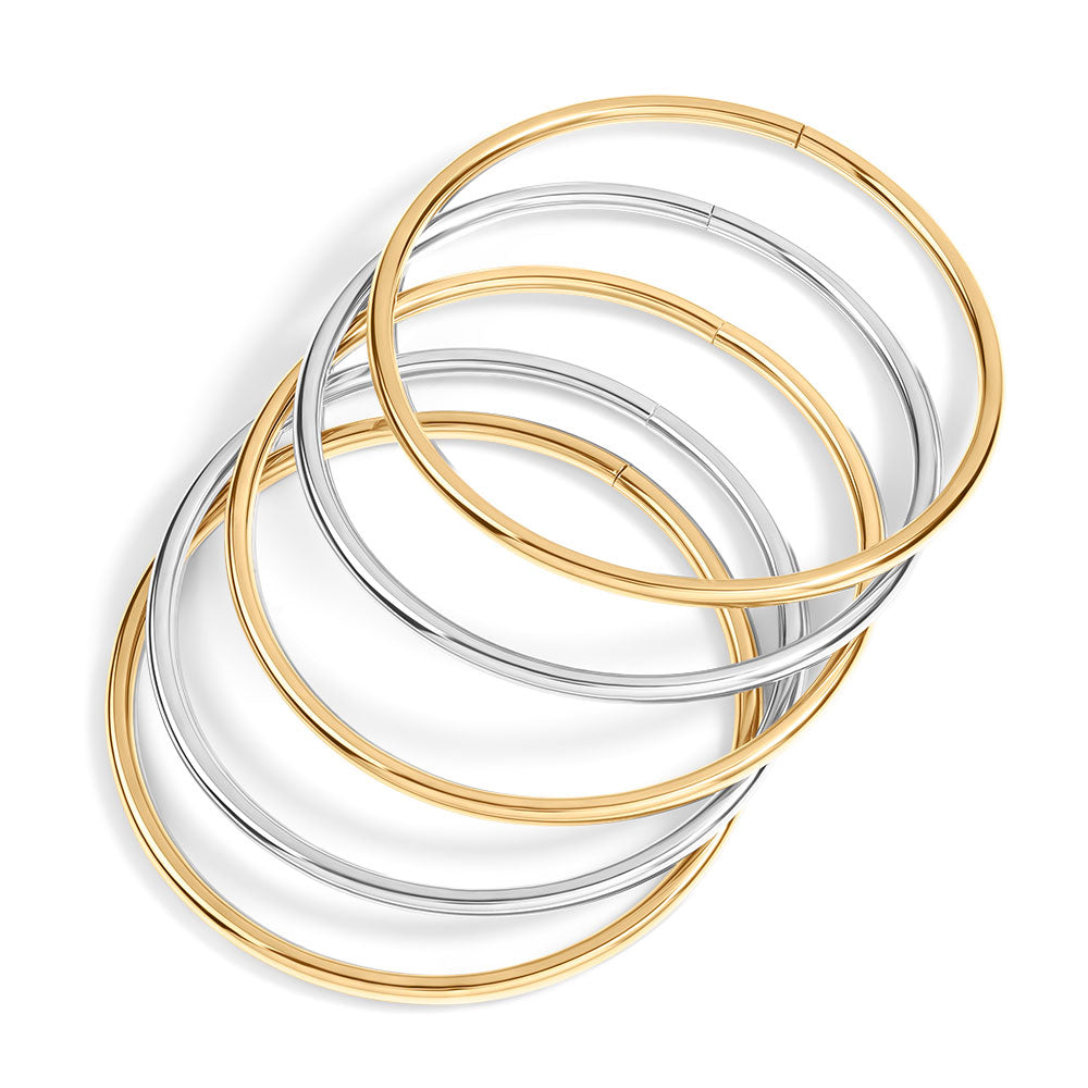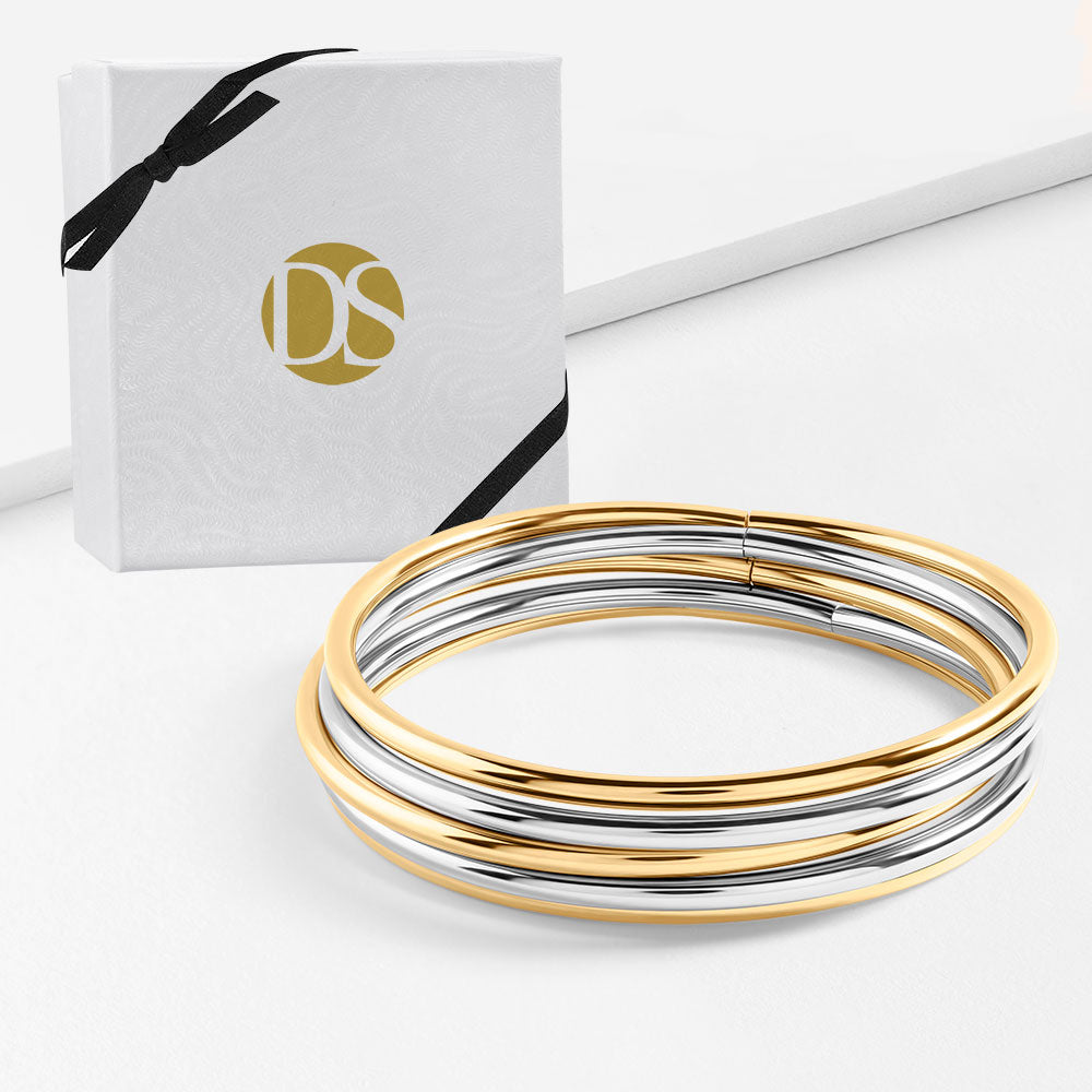 Elevate your accessory game with the Vivienne Two-Tone Stackable Bangle Bracelets. This stylish set features an ideal blend of gold and silver tones, offering endless stacking possibilities. Whether worn together for a bold statement or separately for a more subtle look, these bangles add a touch of elegance and sophistication to any look.