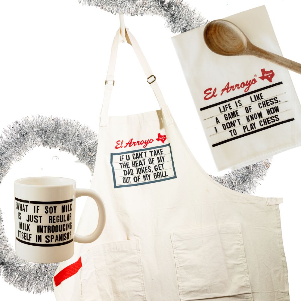 Give Dad the gift of laughter with the El Arroyo Dad Gift Bundle—a great set for the king of dad jokes. Featuring an apron, coffee mug, and tea towel printed with El Arroyo’s famous marquee sign humor, this bundle serves up laughs as good as his barbecue. It’s the ideal way to celebrate dads who love to cook, sip coffee, and crack jokes that make the whole family groan.