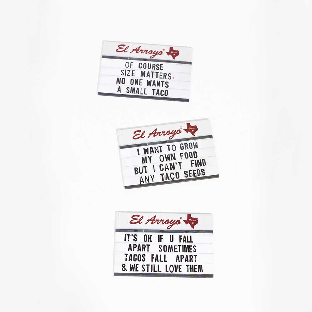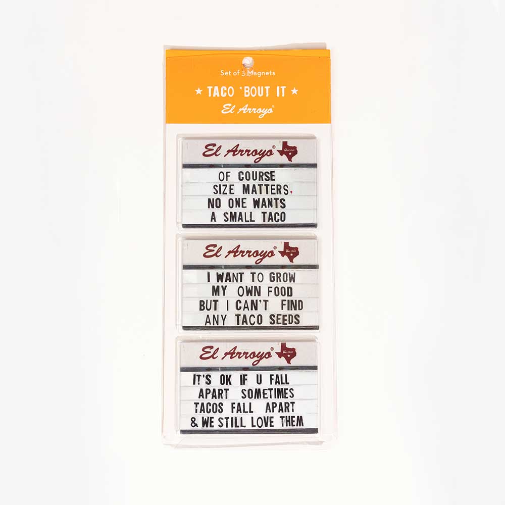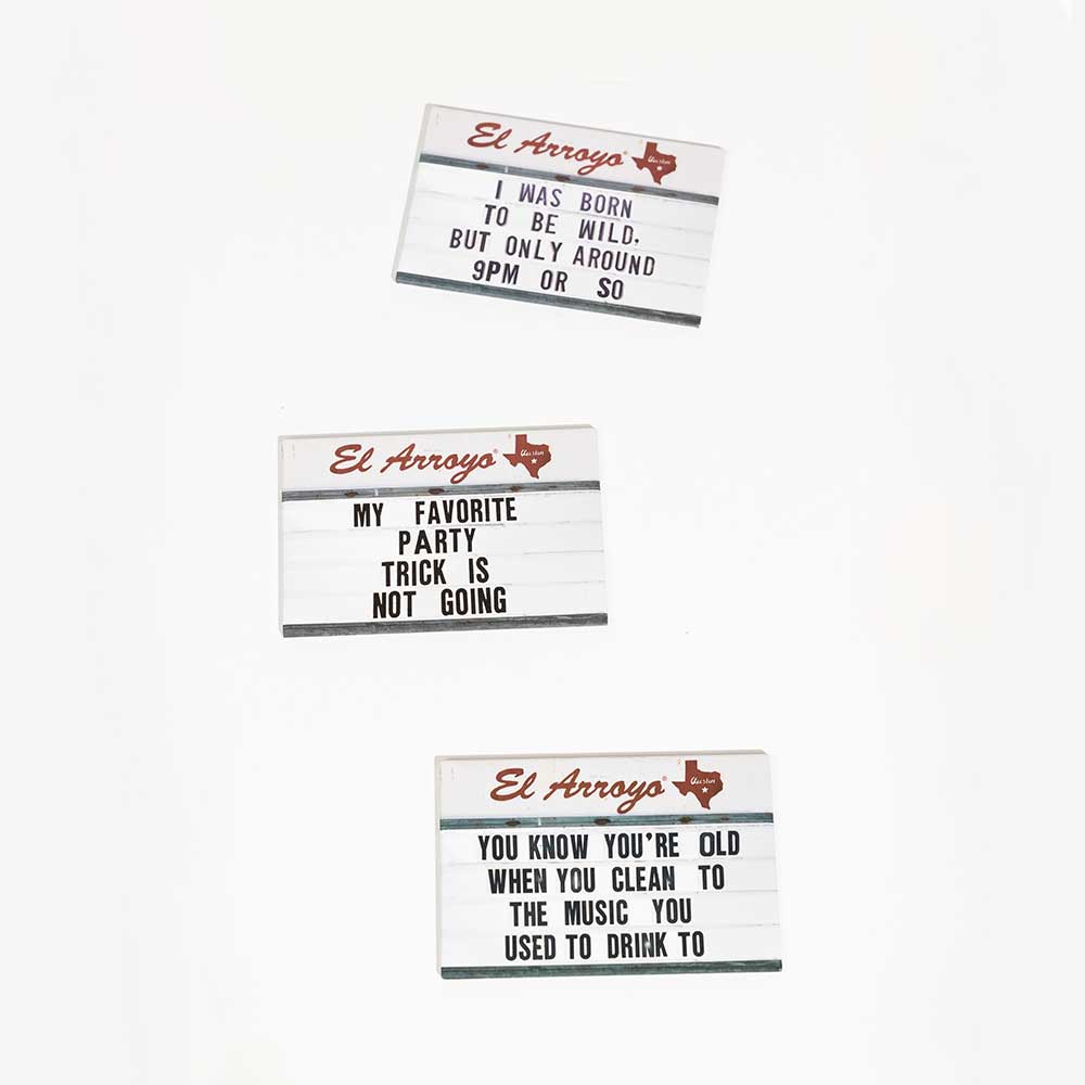 Add a little laugh to your fridge with the El Arroyo Magnet Set. This pack of three button magnets features hilarious marquee sign sayings inspired by Austin’s favorite Tex-Mex spot. Ideal for kitchens, offices, or anywhere that could use a daily dose of El Arroyo humor.
