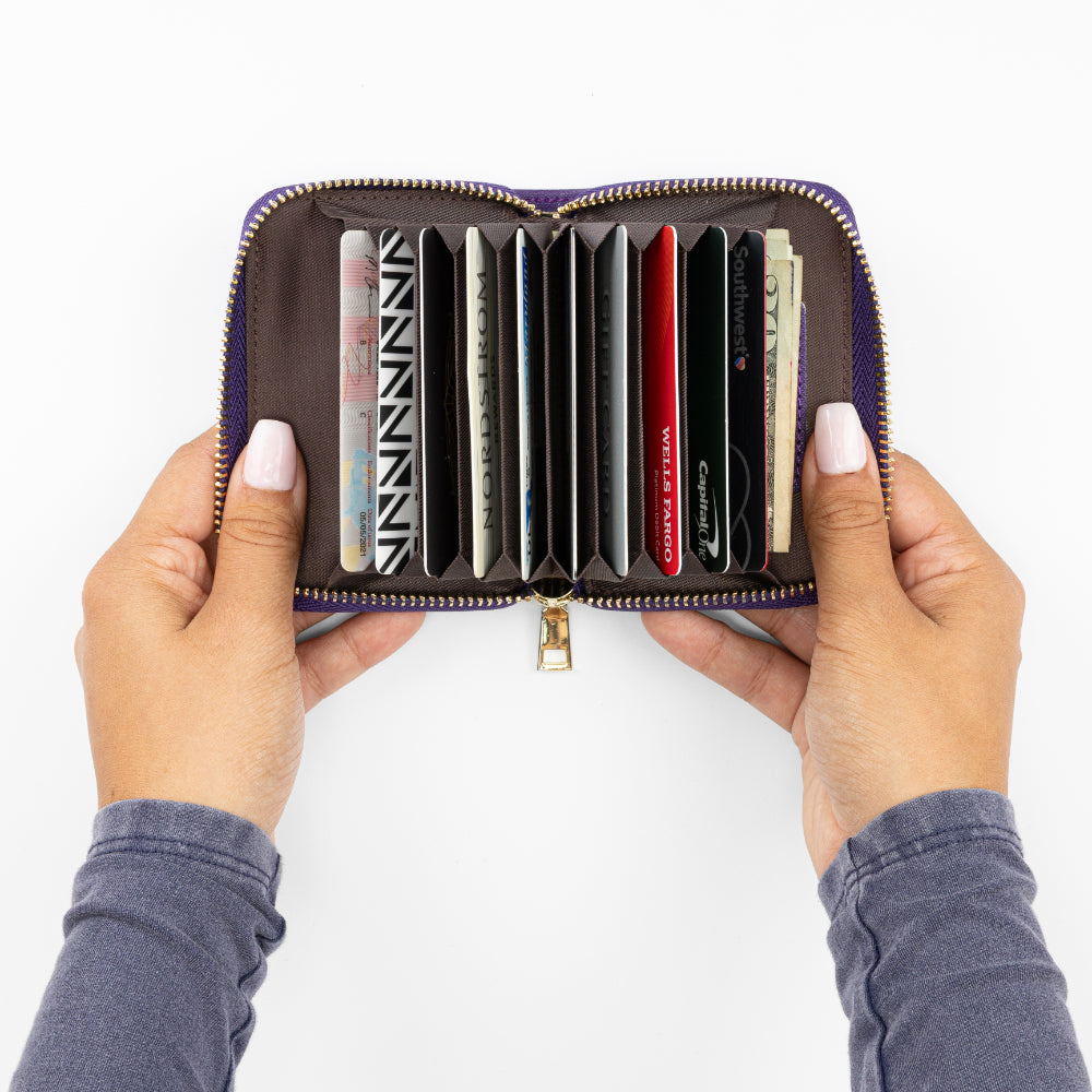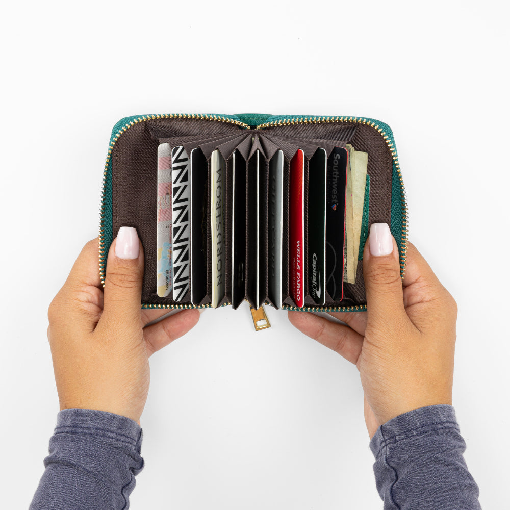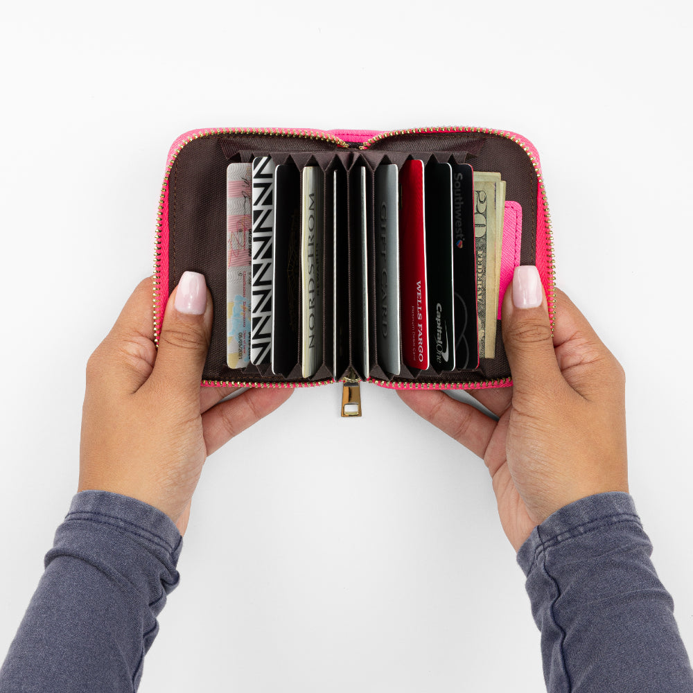 With room for up to ten cards, this accordion-style wallet closes neatly, even when at full capacity. Smartly designed to store both cards and folded bills, it's a colorful and compact way to carry just what you need when traveling lightly.