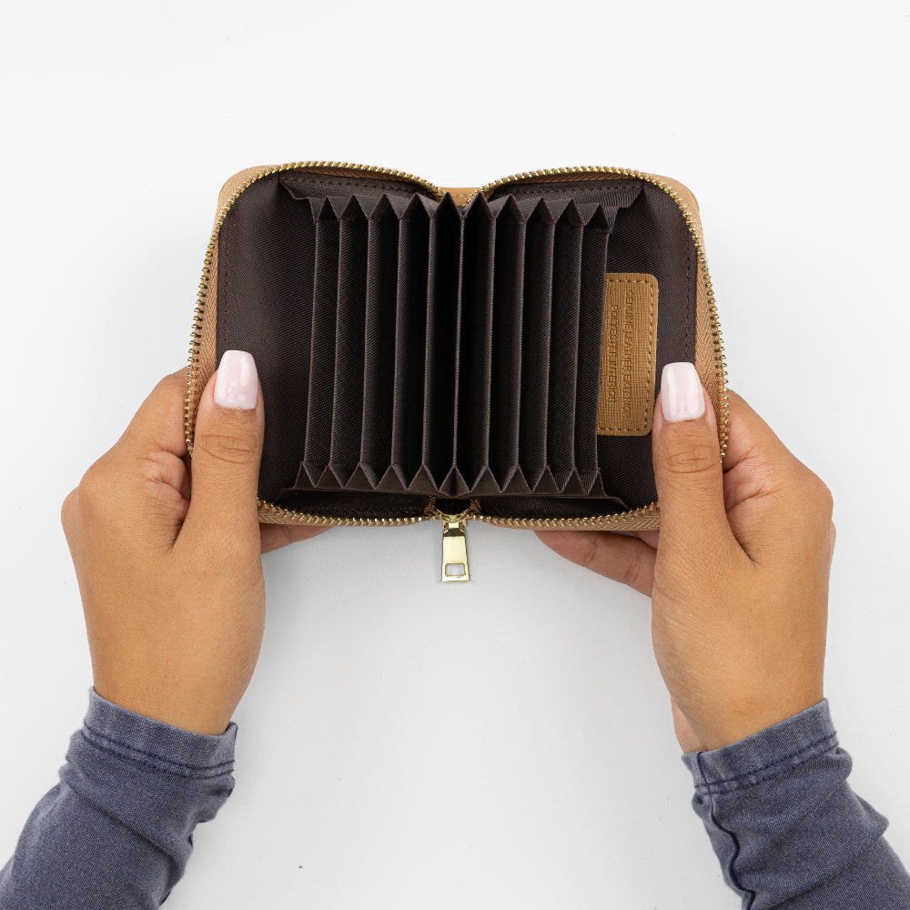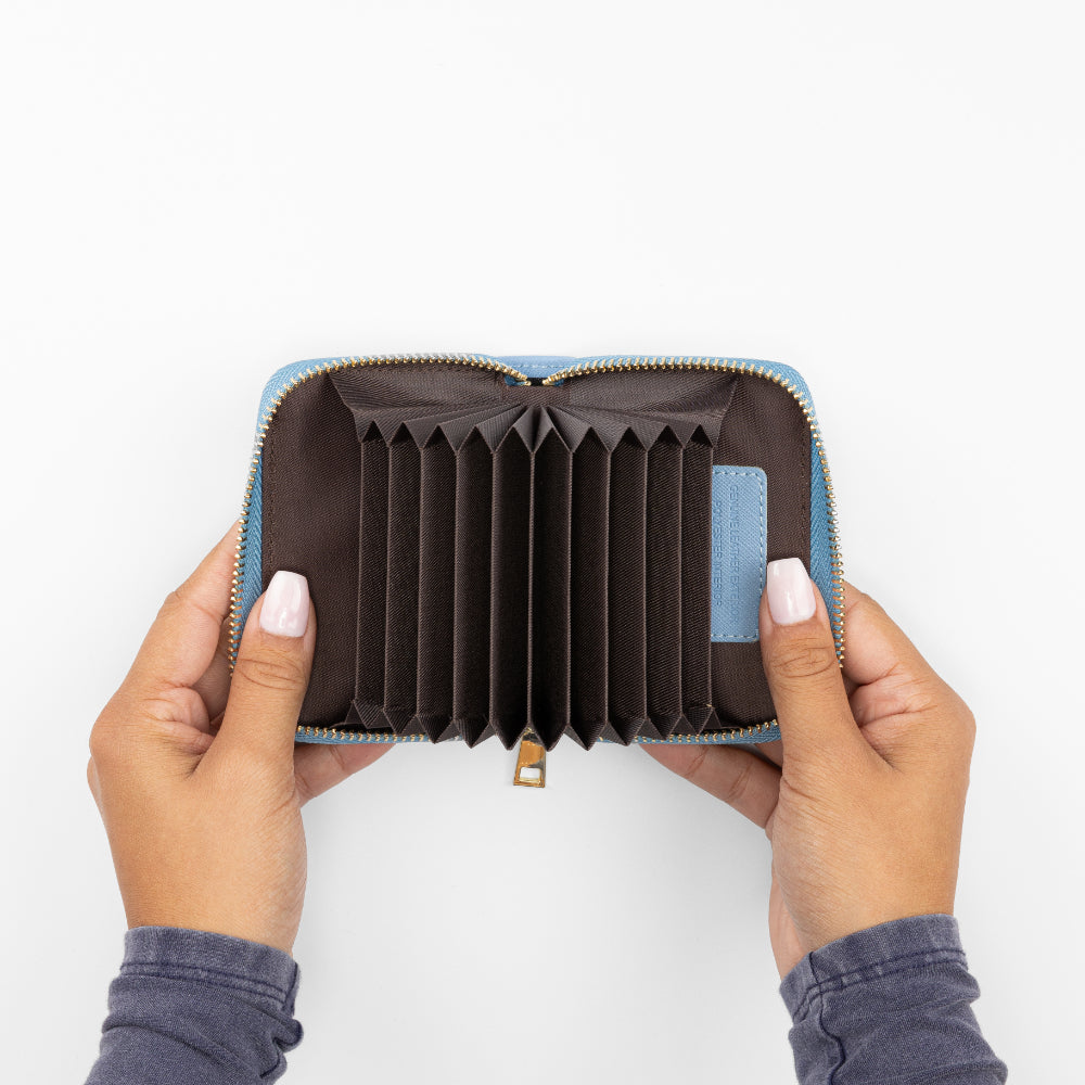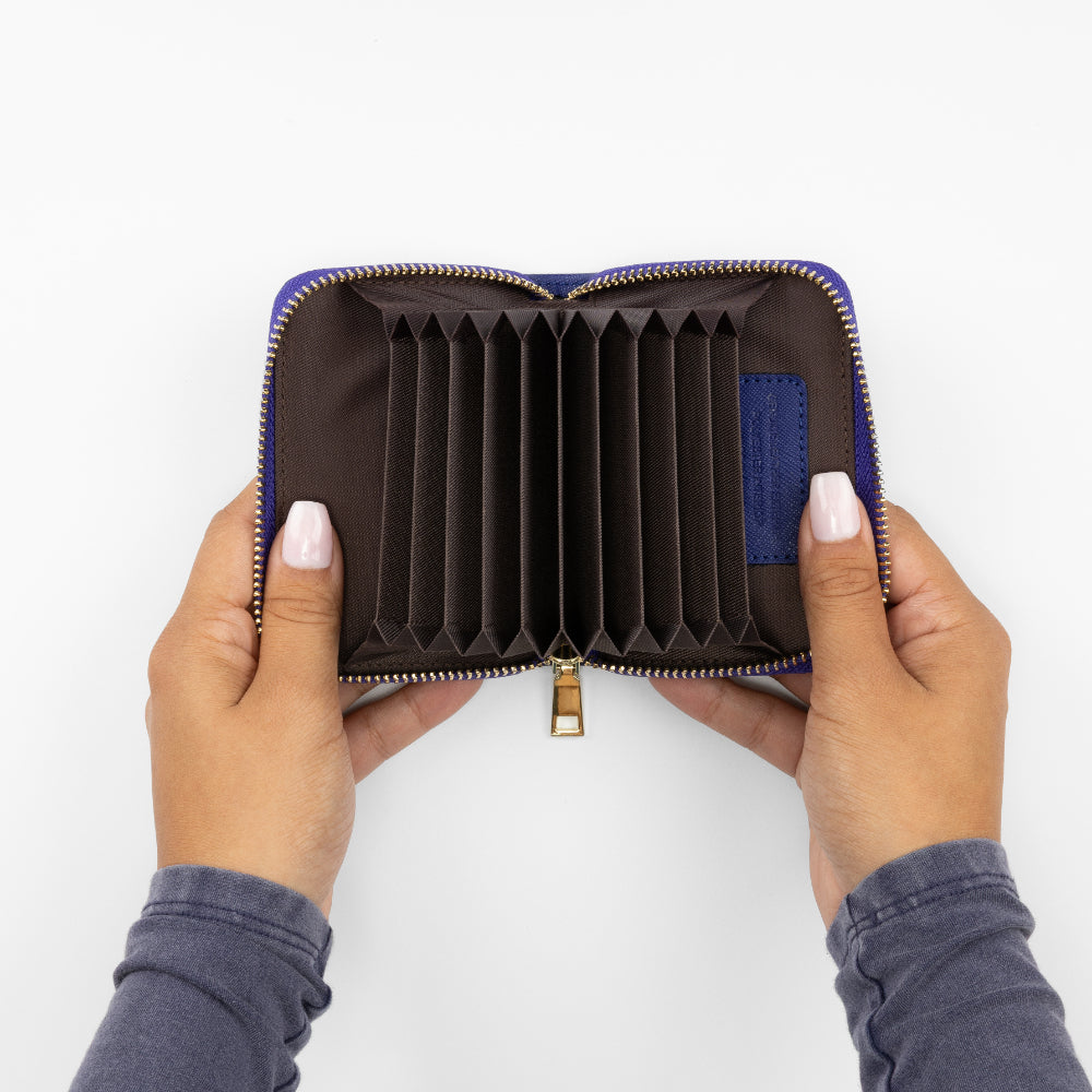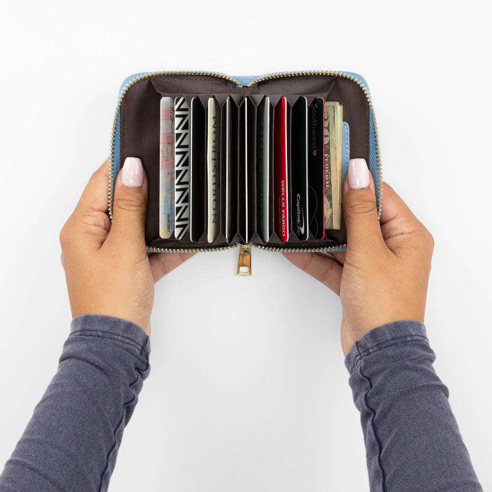 With room for up to ten cards, this accordion-style wallet closes neatly, even when at full capacity. Smartly designed to store both cards and folded bills, it's a colorful and compact way to carry just what you need when traveling lightly.