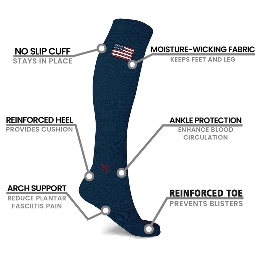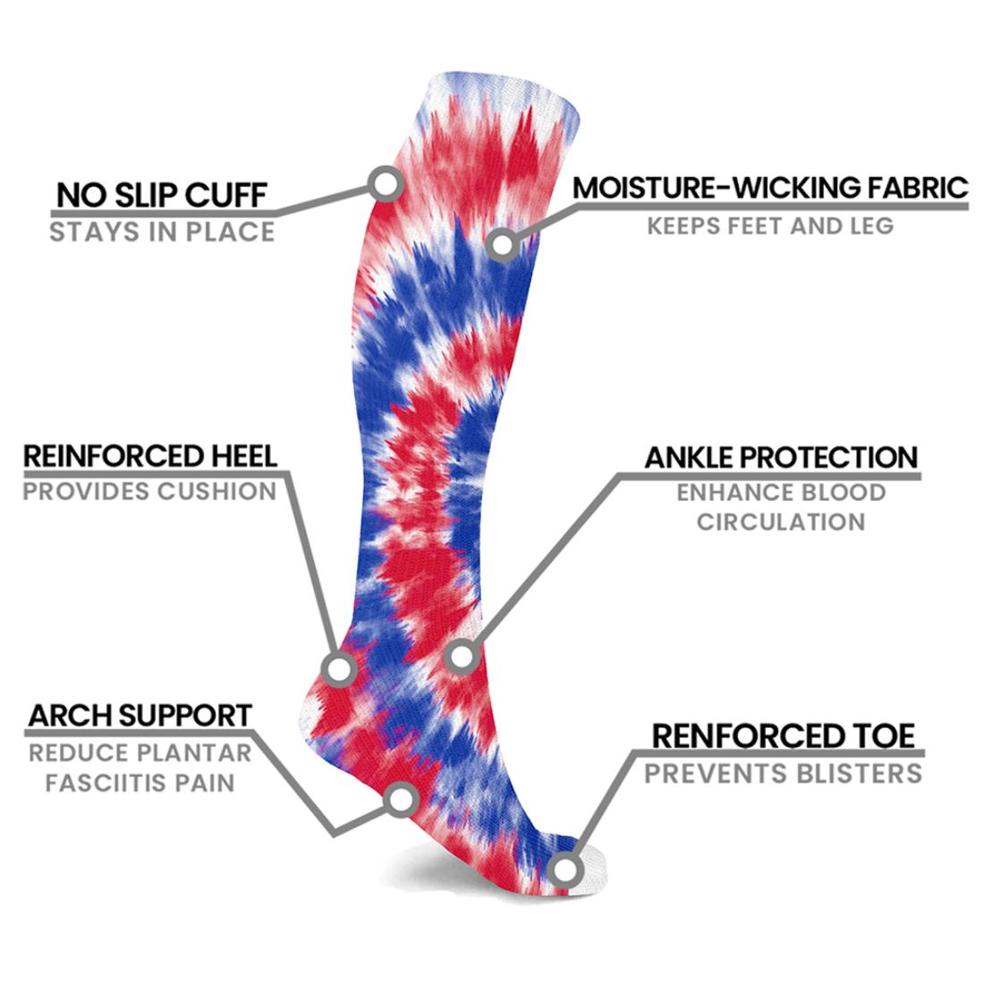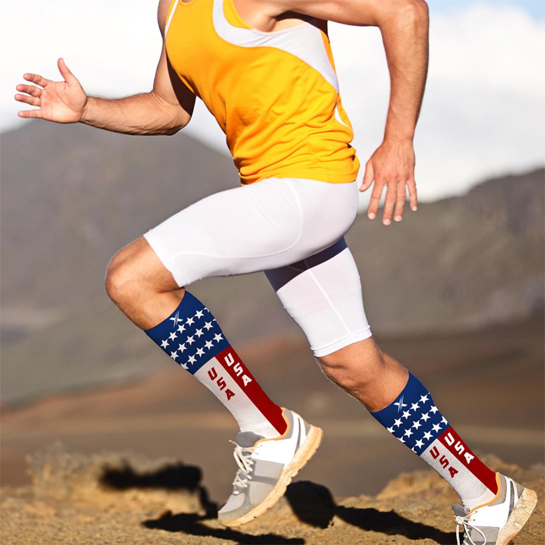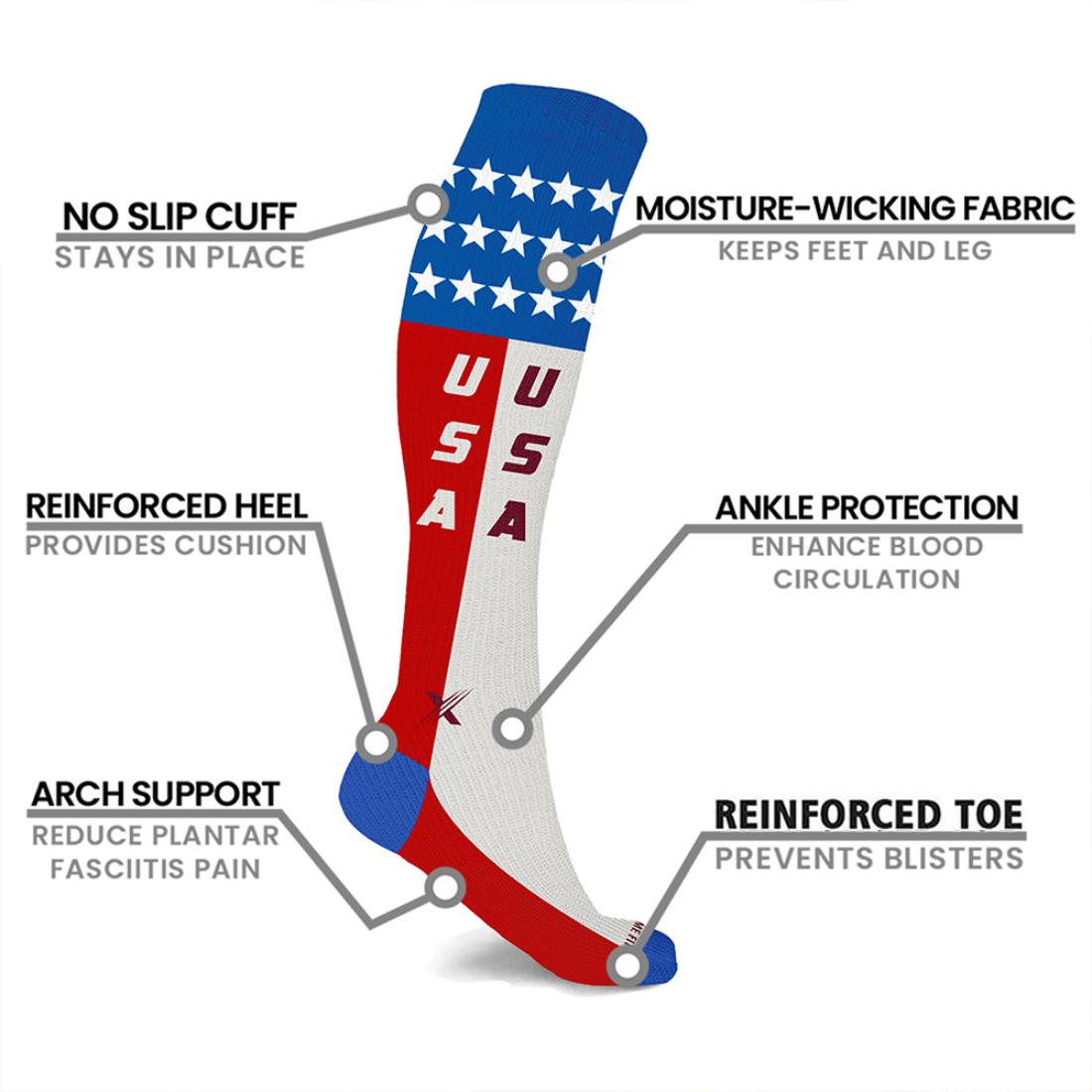 Step into patriotic pride and comfort with these quality knee-high compression socks. Designed to improve circulation, reduce swelling, and relieve aches and fatigue, these socks are ideal for running, cycling, travel, pregnancy, and more.