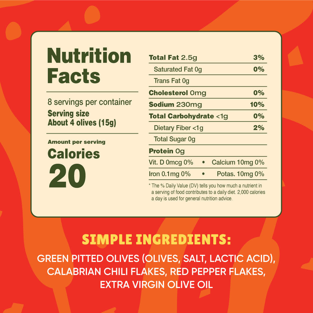 Green Pitted Olives (Olives, Salt, Lactic Acid), Calabrian Chili Flakes, Red Pepper Flakes, Extra Virgin Olive Oil (EVOO)