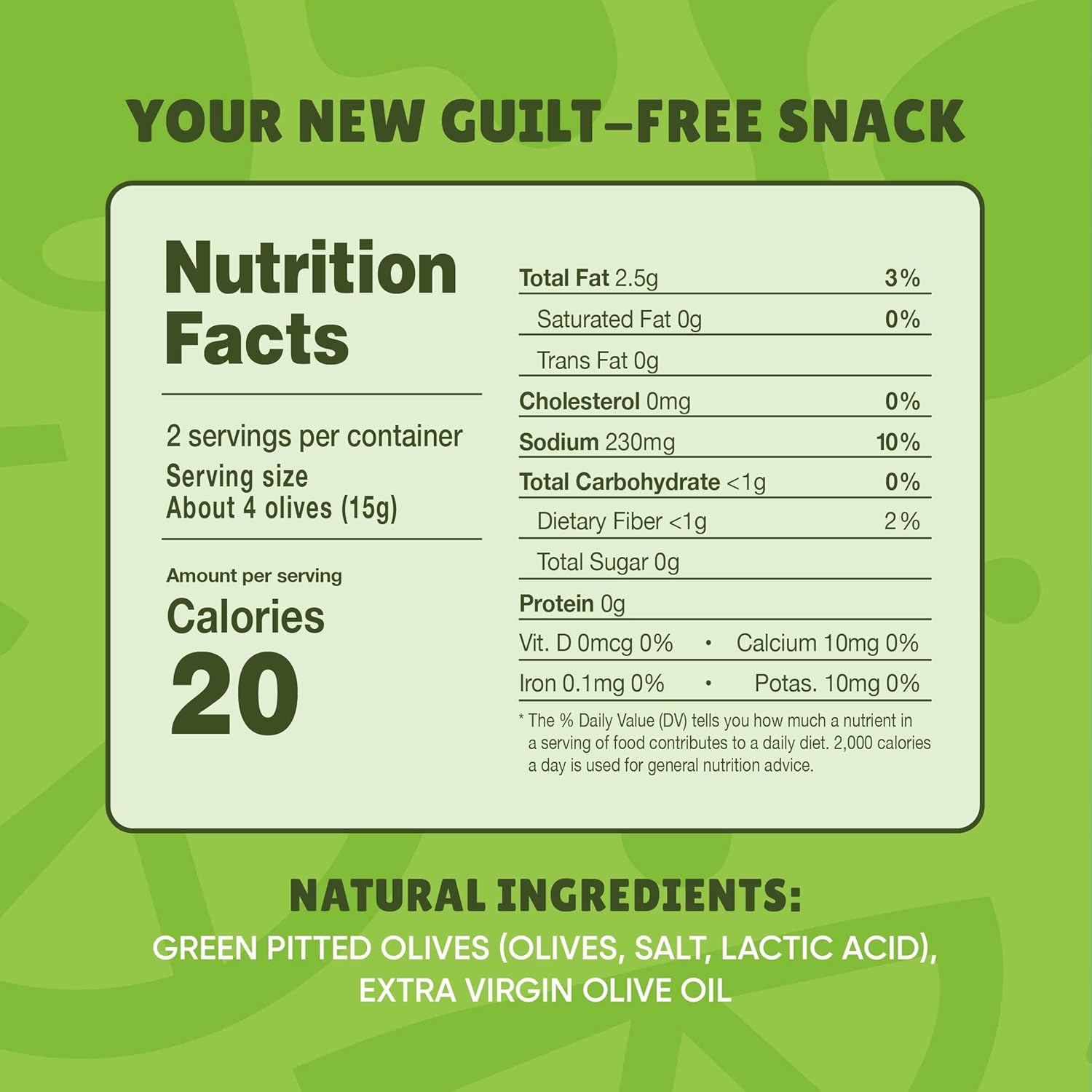 • Original Green Olives: Green Pitted Olives (Olives, Salt, Lactic Acid), Extra Virgin Olive Oil (EVOO)
