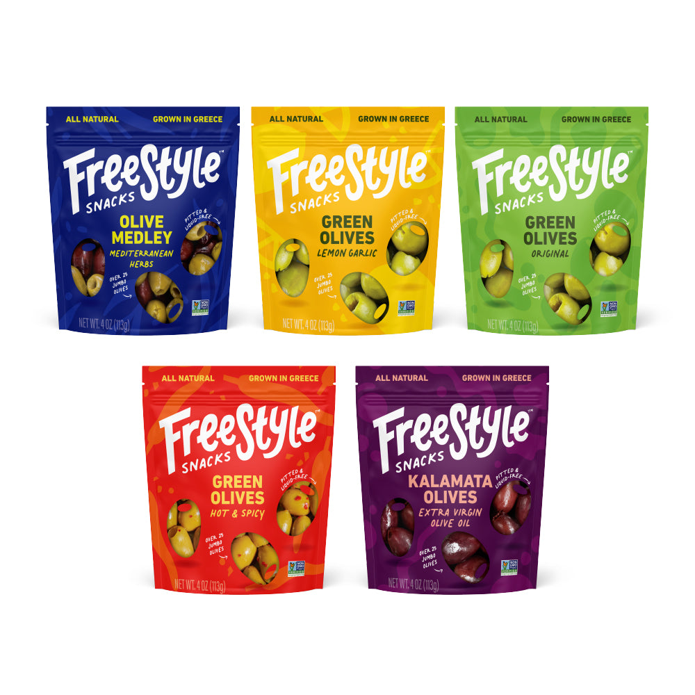 New to Freestyle olives? Start here. This bundle brings together all five signature flavors in resealable pouches made for snacking, charcuterie, or topping your favorite dishes. From zesty citrus to classic Kalamata, it’s a flavor journey straight from Greece to your tastebuds.