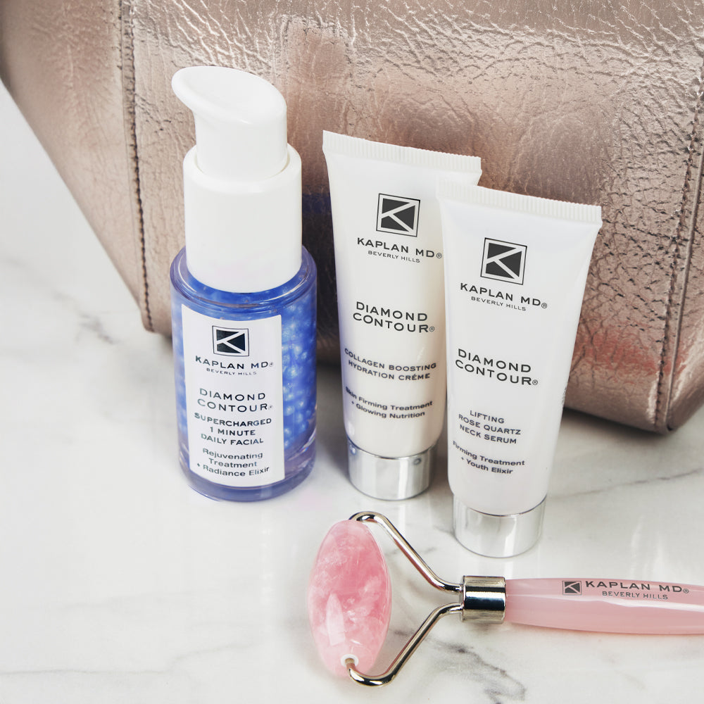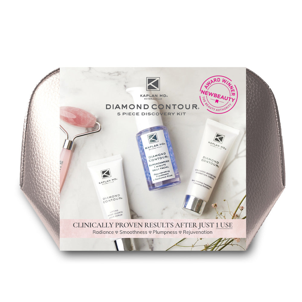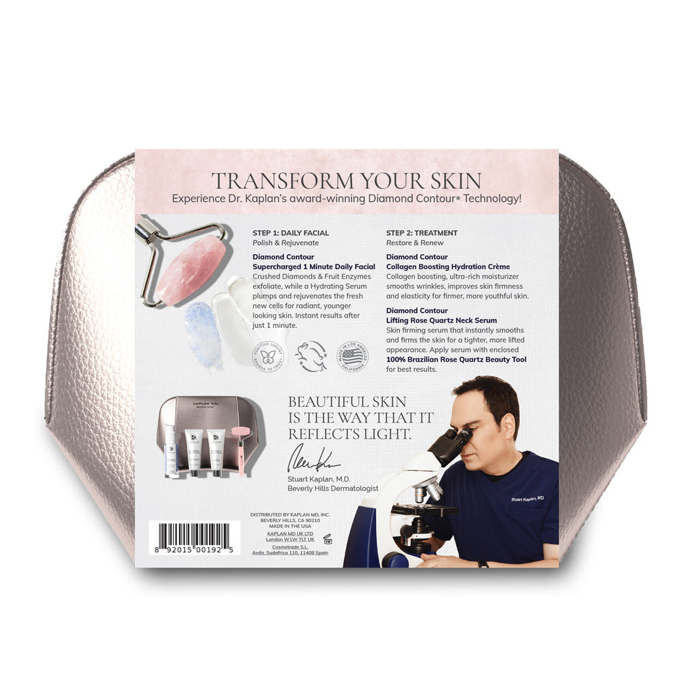 Experience skincare by Beverly Hills Dermatologist to the Stars, Stuart Kaplan, MD! This luxurious Discovery Kit contains a trio of Diamond Contour skincare treatments formulated to transform the skin on your face and neck. Packaged with a 100% Brazilian rose quartz beauty tool to enhance application, along with a faux leather, metallic rose gold cosmetic bag. All sizes are travel-friendly for added convenience.