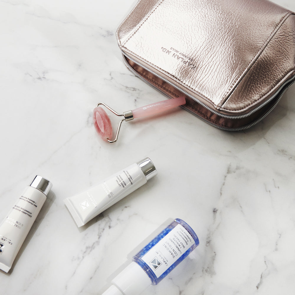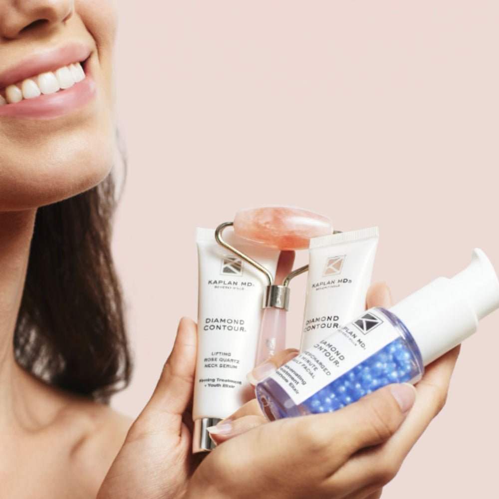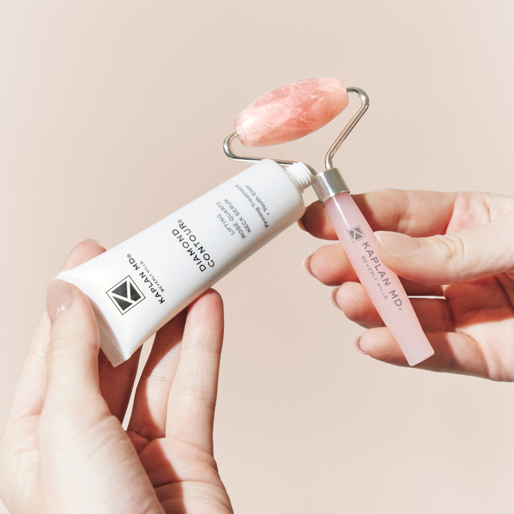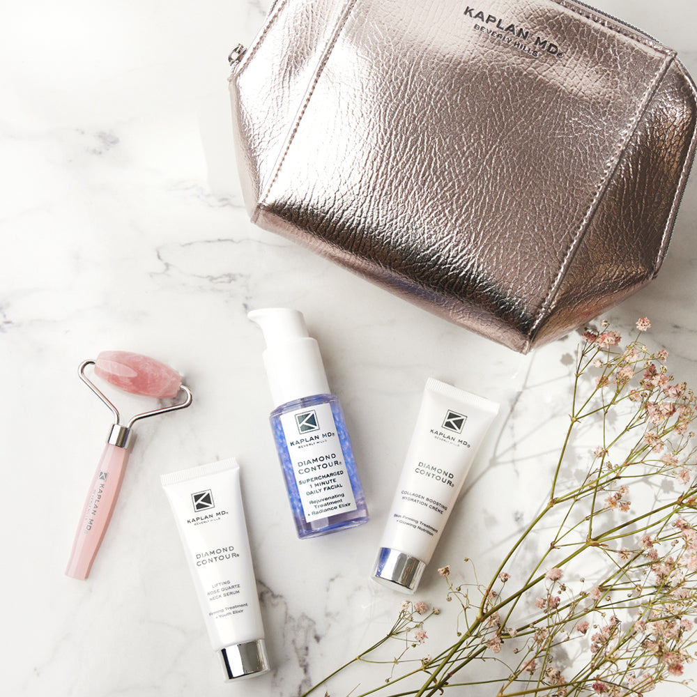 Experience skincare by Beverly Hills Dermatologist to the Stars, Stuart Kaplan, MD! This luxurious Discovery Kit contains a trio of Diamond Contour skincare treatments formulated to transform the skin on your face and neck. Packaged with a 100% Brazilian rose quartz beauty tool to enhance application, along with a faux leather, metallic rose gold cosmetic bag. All sizes are travel-friendly for added convenience.