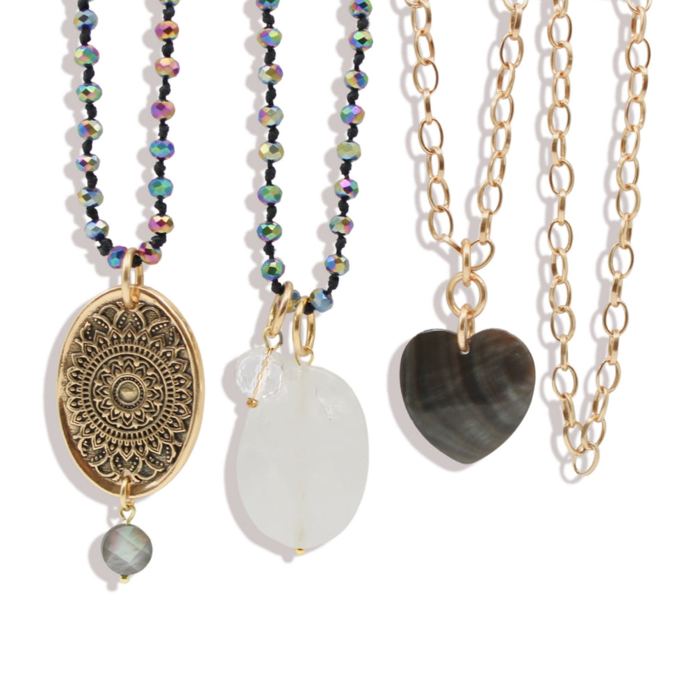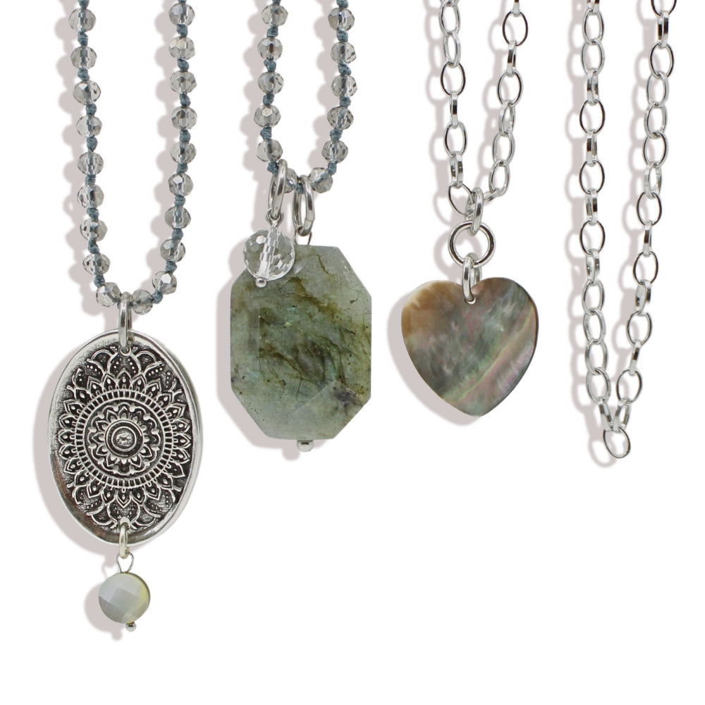 • Silver: Silver finish pendant with grey crystal beads, labradorite, crystal quartz, faceted black lip pearl, and abalone shell heart