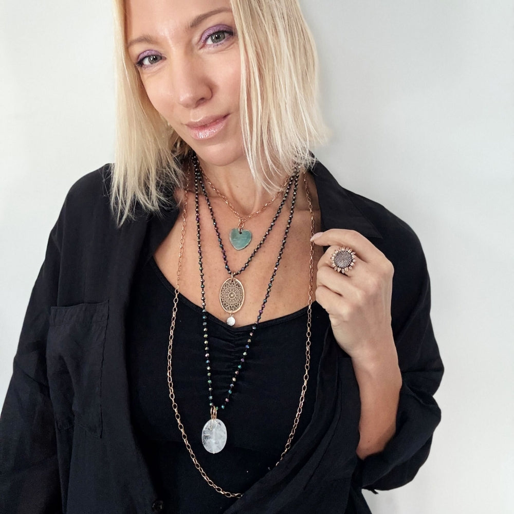 • Antique Gold: Antique gold finish pendant with peacock crystal beads, crystal quartz, faceted black lip pearl, and abalone shell heart