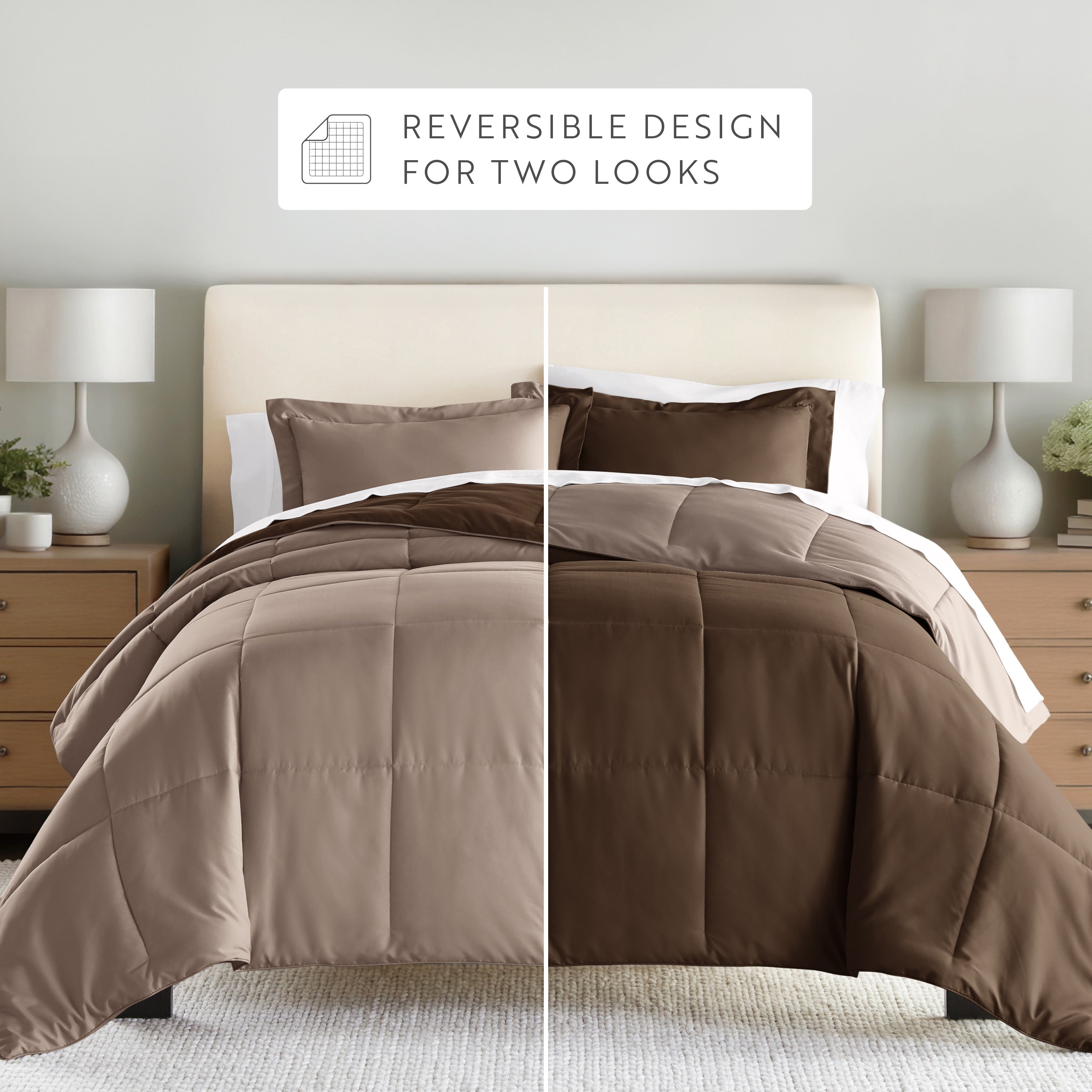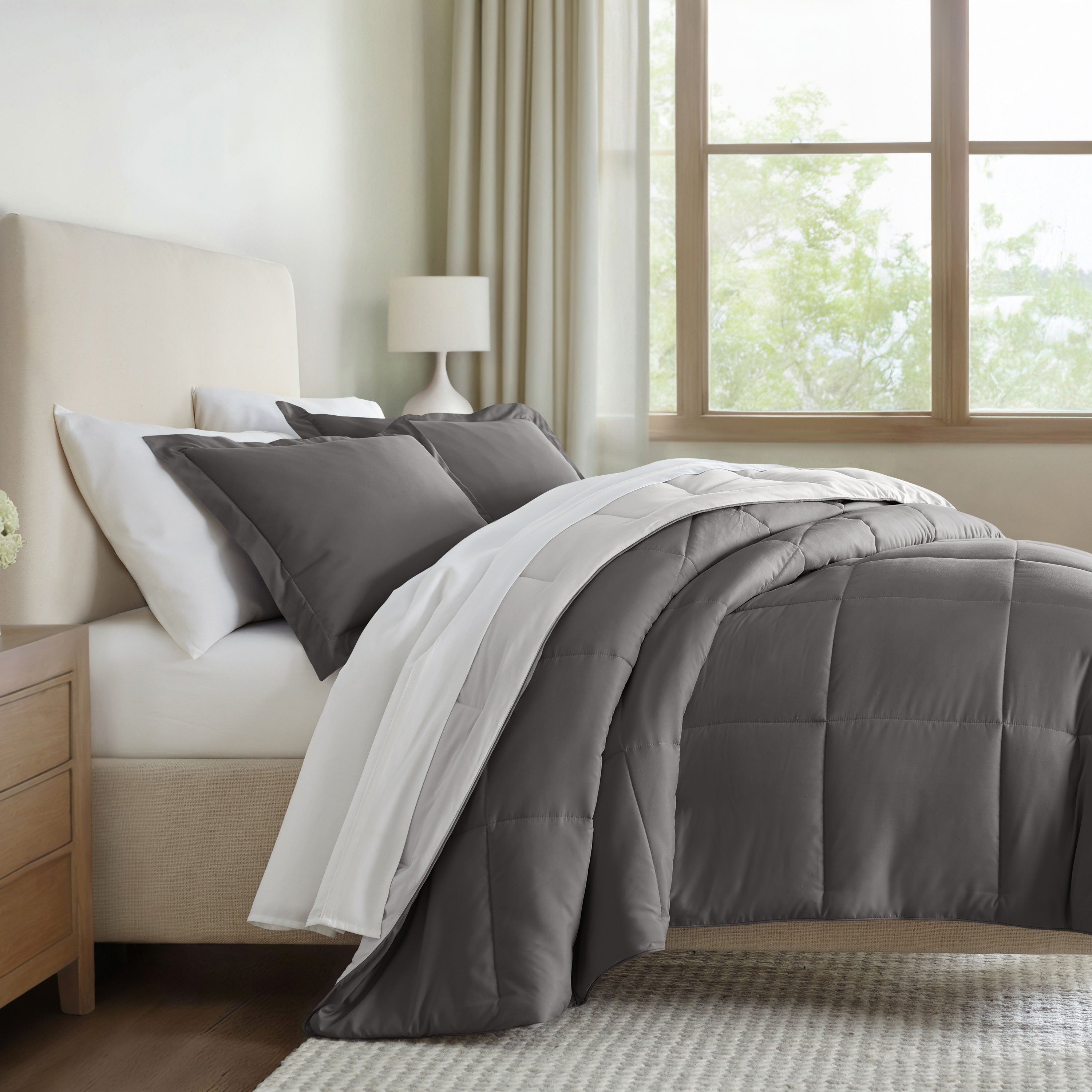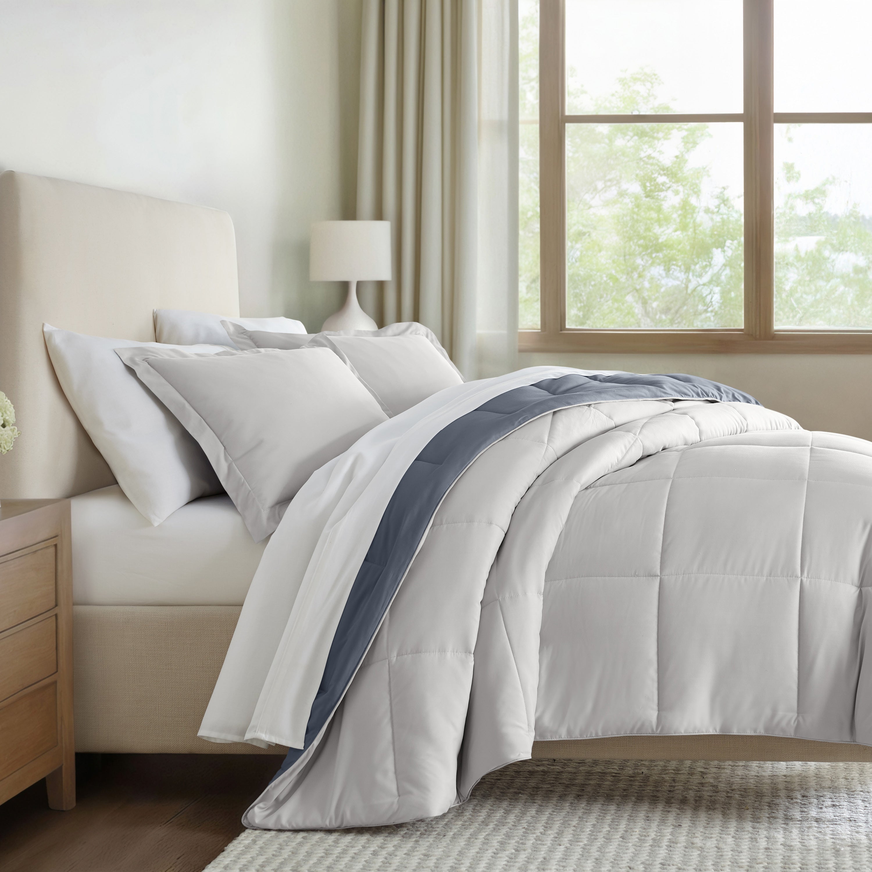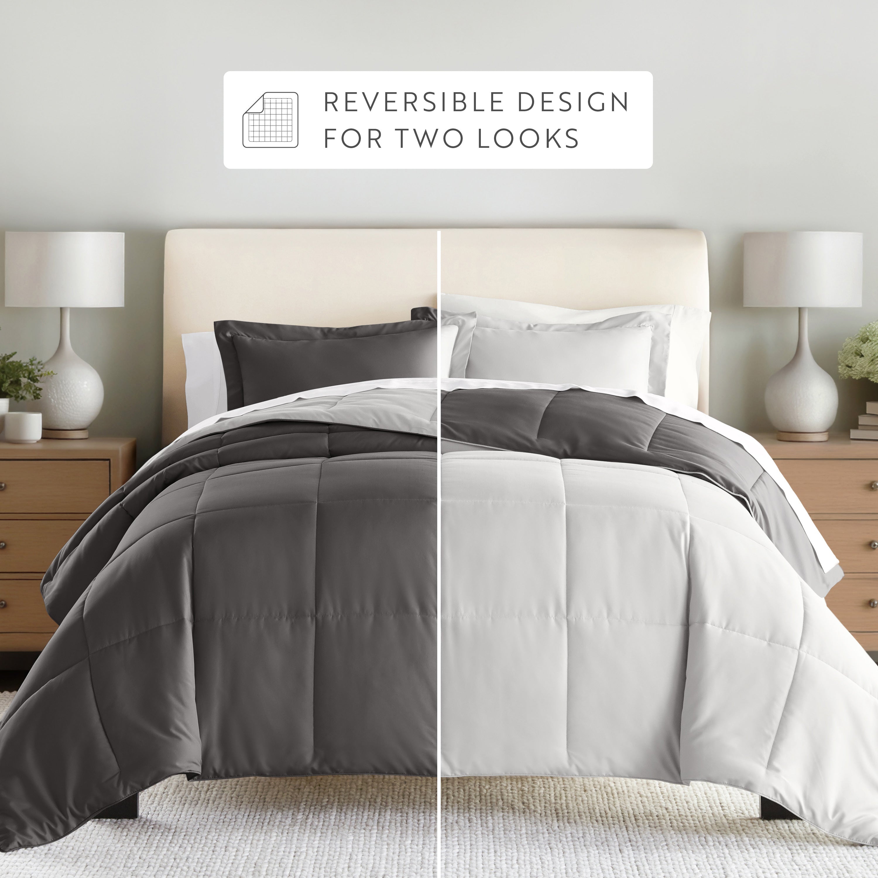 Give your bedding a brand new look and feel with this lightweight, all-season comforter set. Presenting a down-alternative quality, its incredible softness makes it the ideal comforter to keep you cozy all year round. Featuring a reversible design of aesthetically matched colors, this set is ideal for making quick style changes to your sleep space!