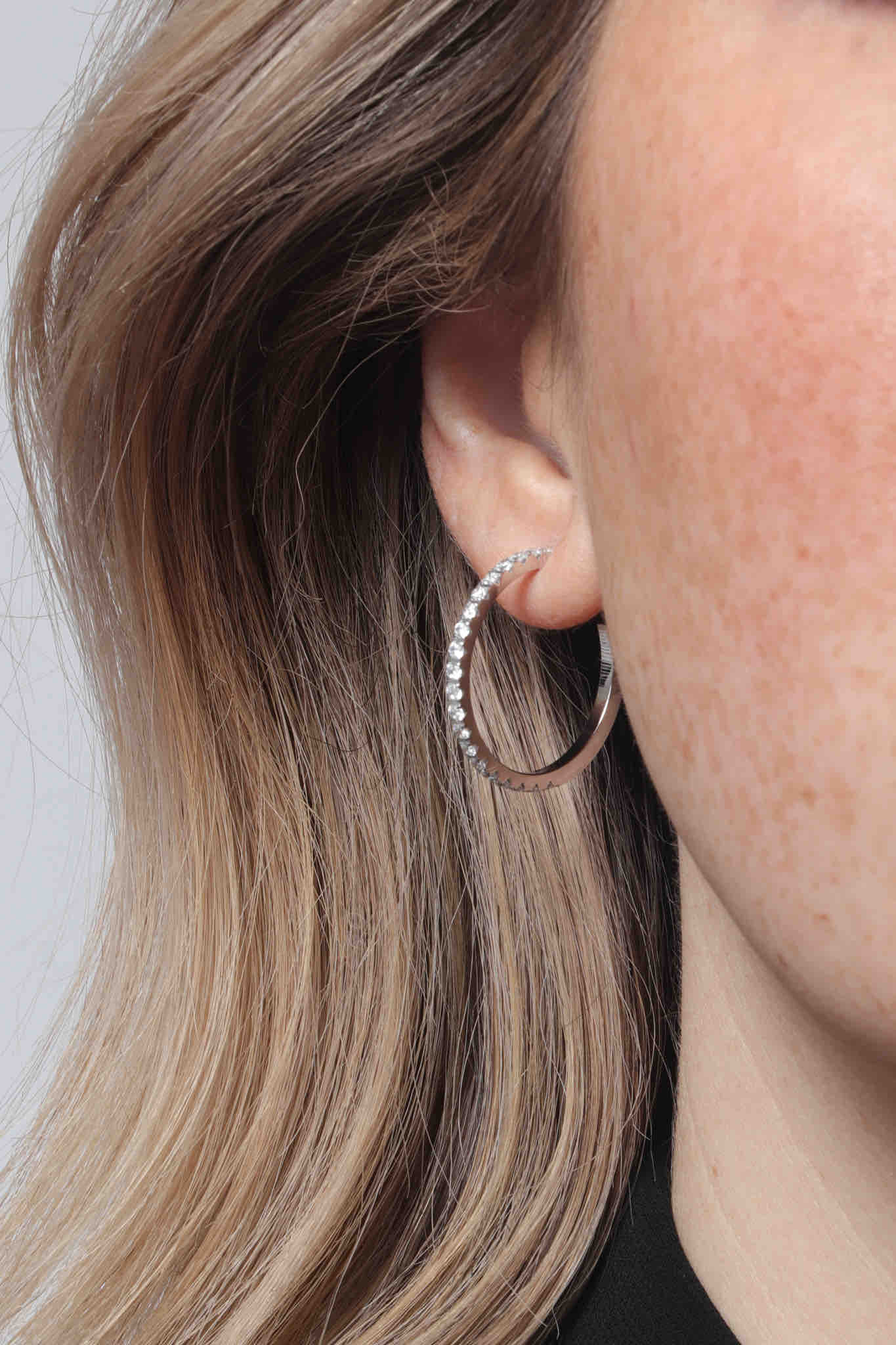 Elevate your style with these thin geometric stud hoops adorned with simulated diamond details. Their sleek design and sparkling accents make them a stunning accessory that adds a touch of elegance to any look.