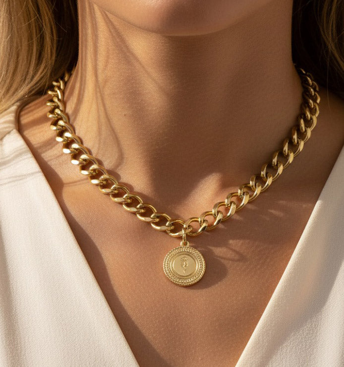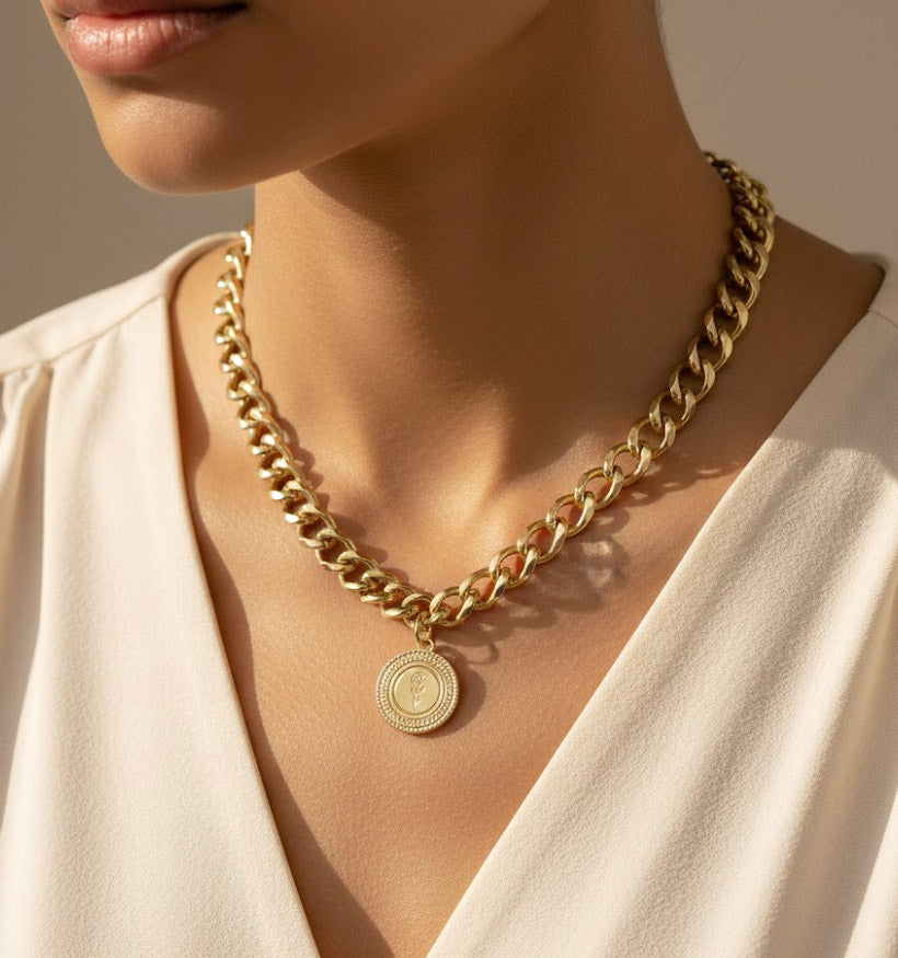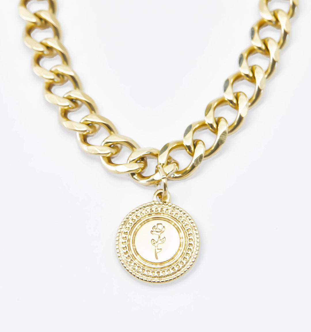 Bold, beautiful, and rich with meaning: this necklace features a coin pendant resting on a bold Cuban-link chain for a modern-meets-romantic look. The rose symbolizes love, strength, and resilience—making it the ideal piece for anyone rooted in softness and power.
