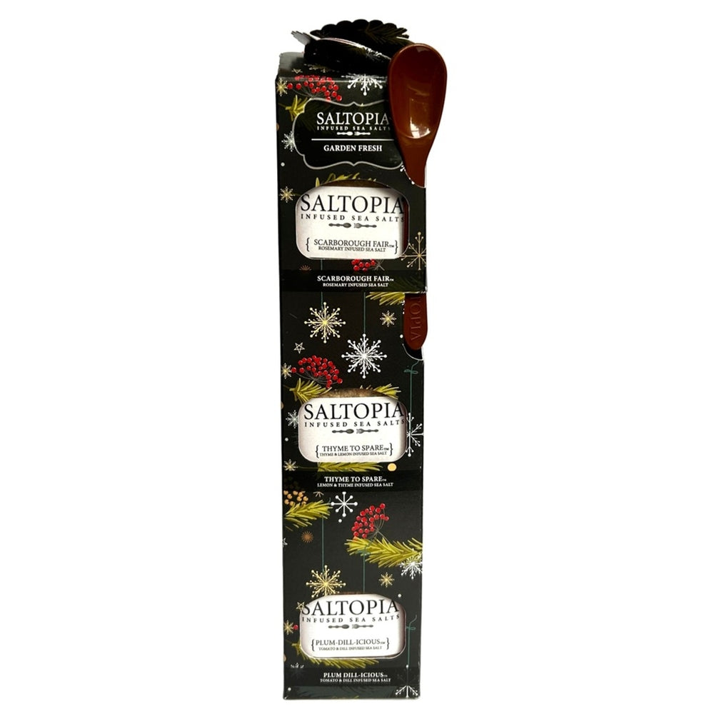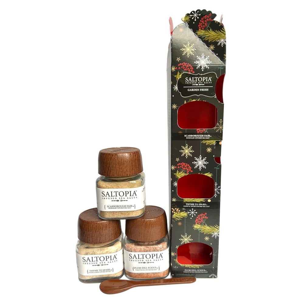 Enjoy garden-fresh flavors throughout the year with this beautifully designed three-jar gift tower. Each flavor has been hand-crafted to capture the garden’s best flavors during harvest season, from ripe plum tomatoes to delicate fresh herbs, including dill and thyme. This set also includes six corresponding recipes printed directly on the packaging and a signature spoon for sprinkling.