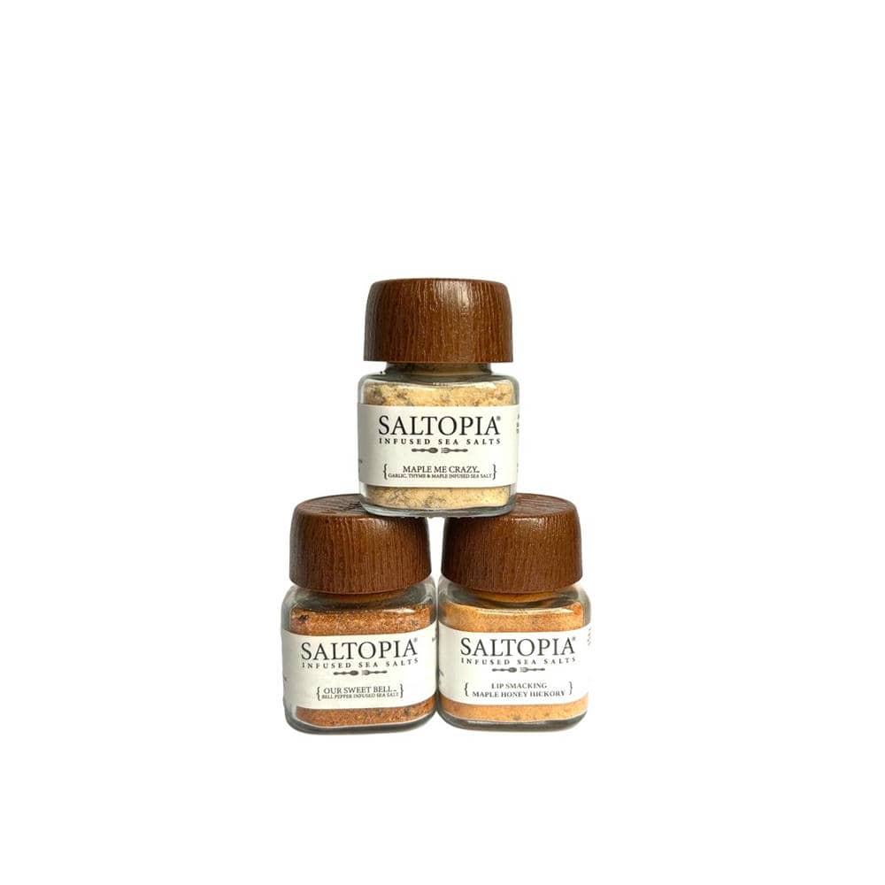 These delectable flavors cater to the satisfying combinations of sweet and salty, which create a more complex taste experience. This pairing activates different taste receptors simultaneously, increasing pleasure and cravings. The combinations in this trio gift set combine hickory and honey, maple and garlic, and sweet bell peppers. Each glass jar is beautifully packaged with its own recipe card and signature spoon for sprinkling. Either present the complete trio as a gift, or surprise three different recipients!