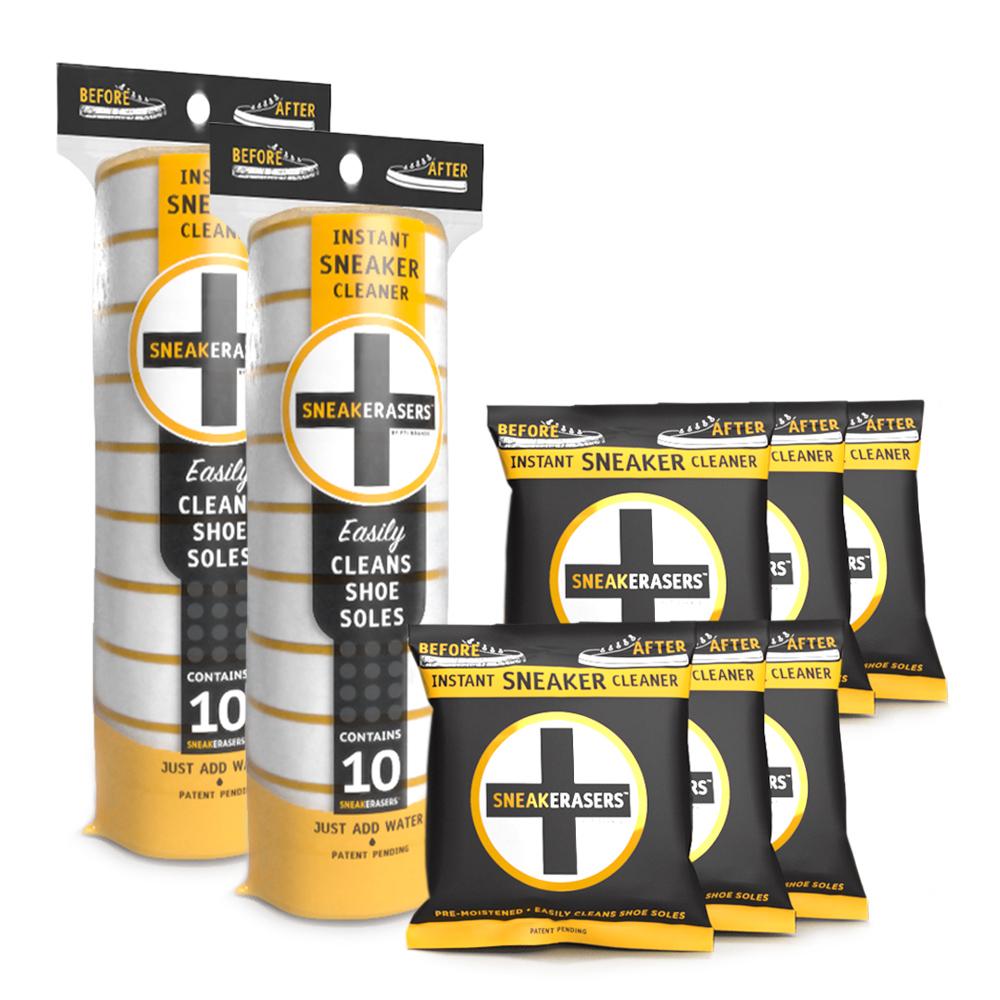 This bundle combines SneakERASERS sneaker cleaning sponges and ready-to-use pre-moistened singles for the ultimate shoe cleaning solution anytime you need it. The sponges give you a reliable supply for at-home cleanings, while the singles are ideal for quick touch-ups on the go. Together they deliver fast, chemical-free results that keep sneakers, cleats, and everyday shoes looking fresh without the hassle of traditional kits.