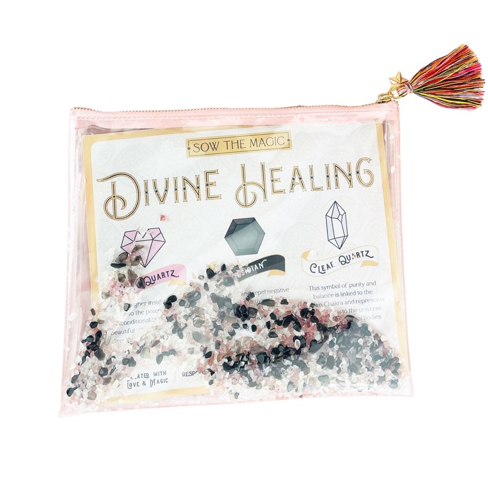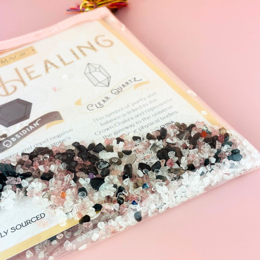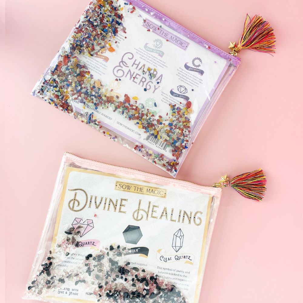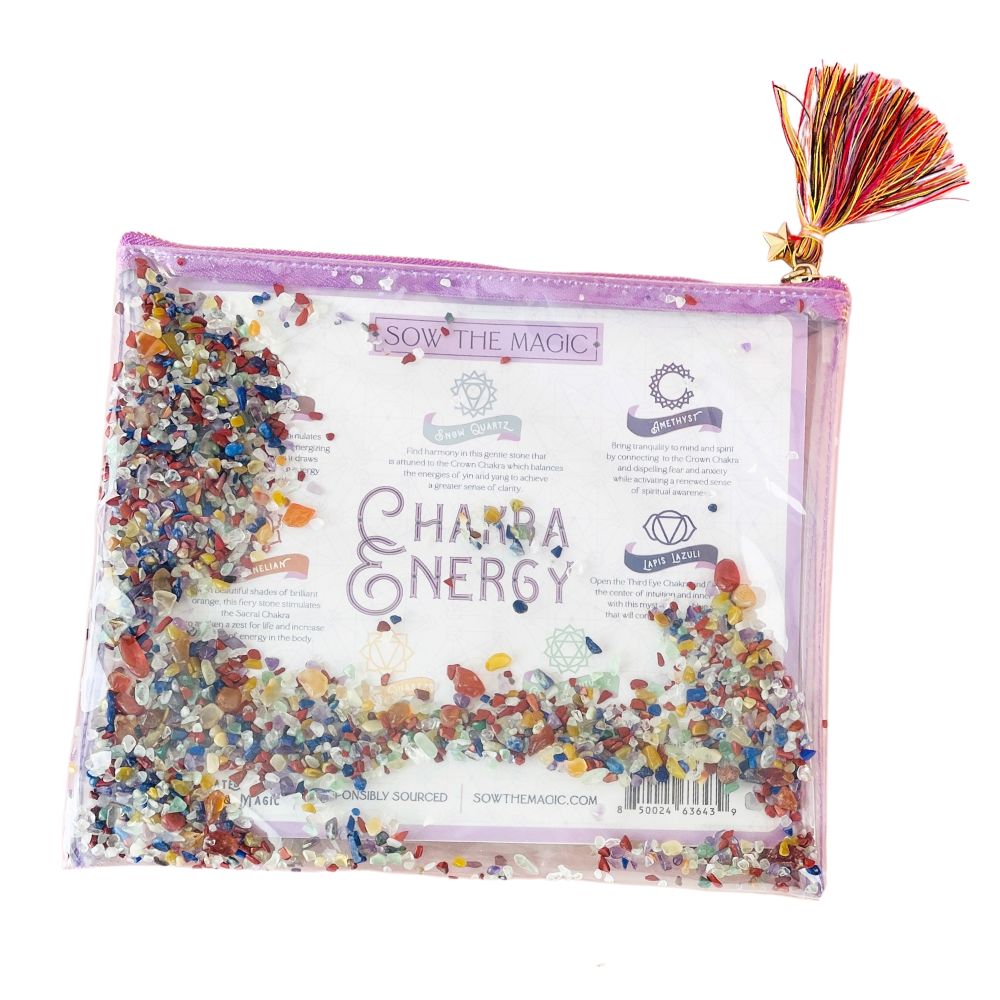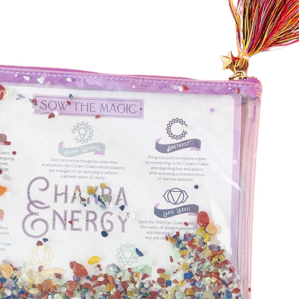 Infuse your treasures with good energy. A lovely array of natural stones is sewn into the lining of this bag, so they don't fall out. In addition to being aesthetically delightful, it's great fun to rotate the bag and listen to the cascading gems as they trickle down like rain.