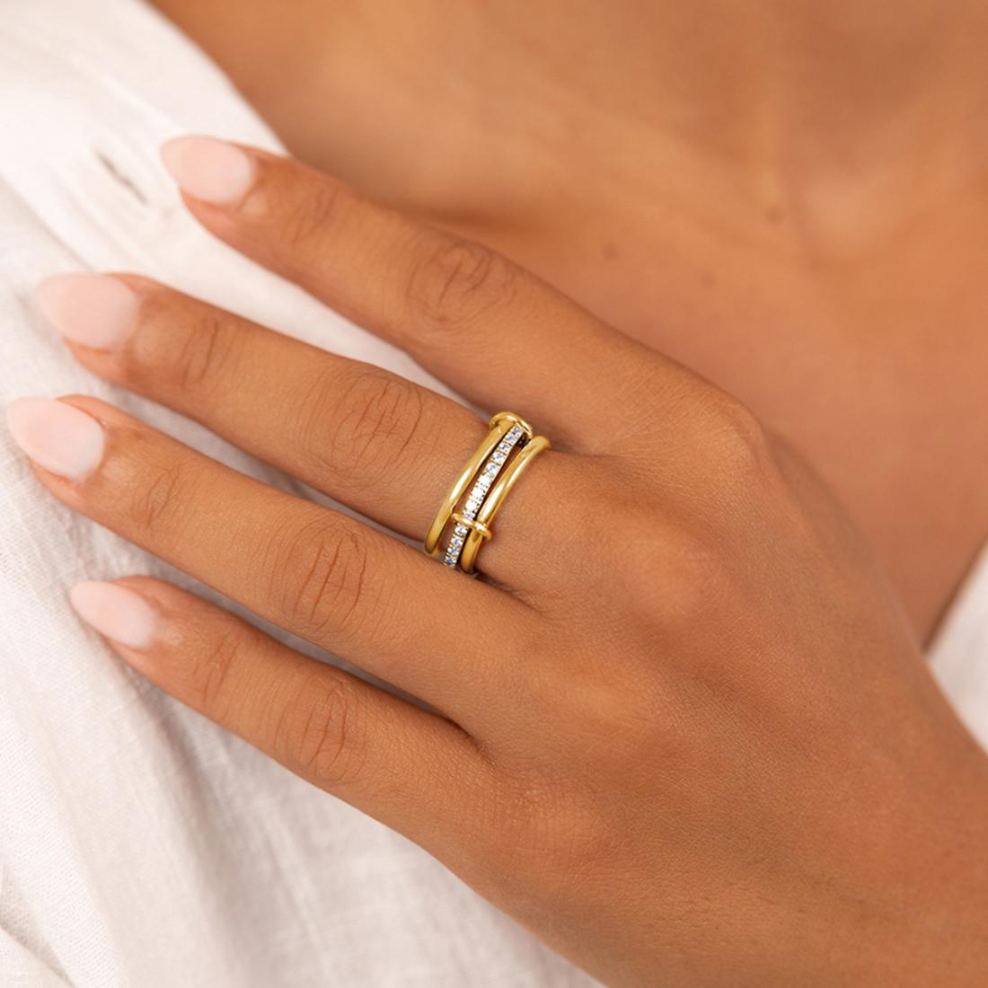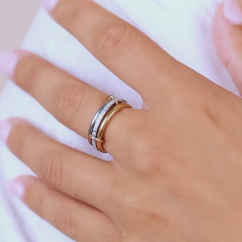 Architectural, but wearable. This ring layers clean lines with a hint of edge—featuring sleek silver curves and a center row of baguette-cut cubic zirconia stones. Your everyday stack, reimagined.