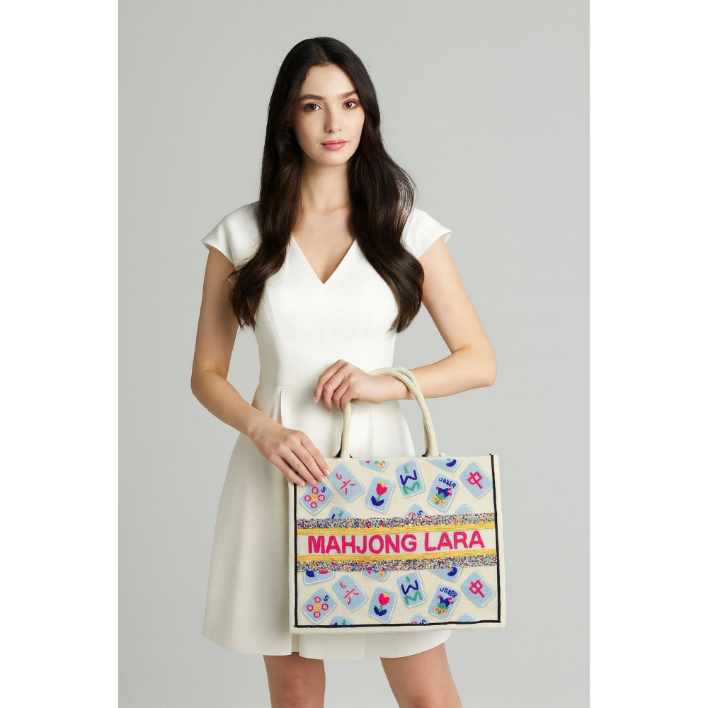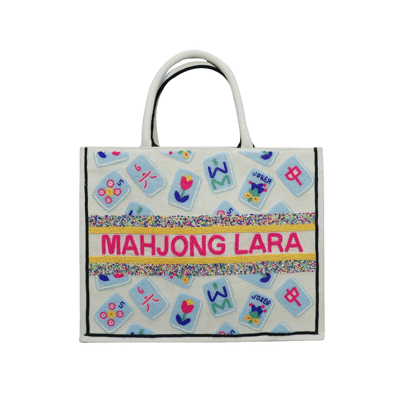 A made-to-order, hand-beaded tote with a stylish mahjong design. This bag is fun and colorful, can be personalized, and is sure to be a head-turner!