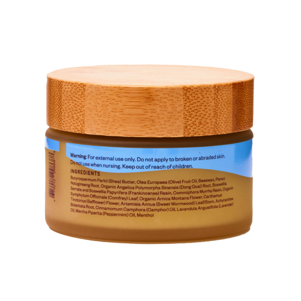 Butyrospermum Parkii (Shea) Butter, Olea Europoaea (Olive) Fruit Oil, Beeswax, Panax Notoginseng Root Powder, Organic Angelica Polymorpha Sinensis (Dong Quai) Root Powder, Boswellia Serrata and Boswellia Papyrifera (Frankincense) Resin, Commiphora Myrrha Resin, Organic Symphytum Officinale (Comfrey) Leaf Powder, Organic Arnica Montana Flower, Carthamus Tinctorius (Safflower) Flower, Artemisia Annua (Sweet Wormwood) Leaf/Stem Extract, Achyranthes Bidentata Root, Cinnamomum Camphora (Camphor) Oil, Lavandula Angustifolia (Lavender) Oil, Mentha Piperita (Pepperment) Oil, Menthol