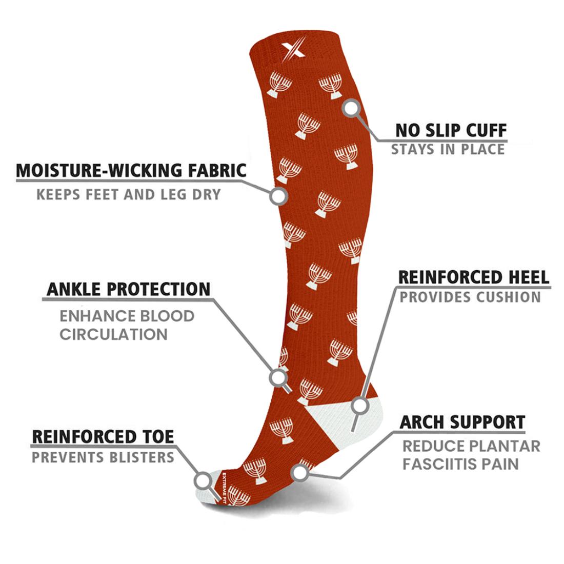 Includes three (3) pairs of Hanukkah Knee-High Compression Socks in size of your choice
